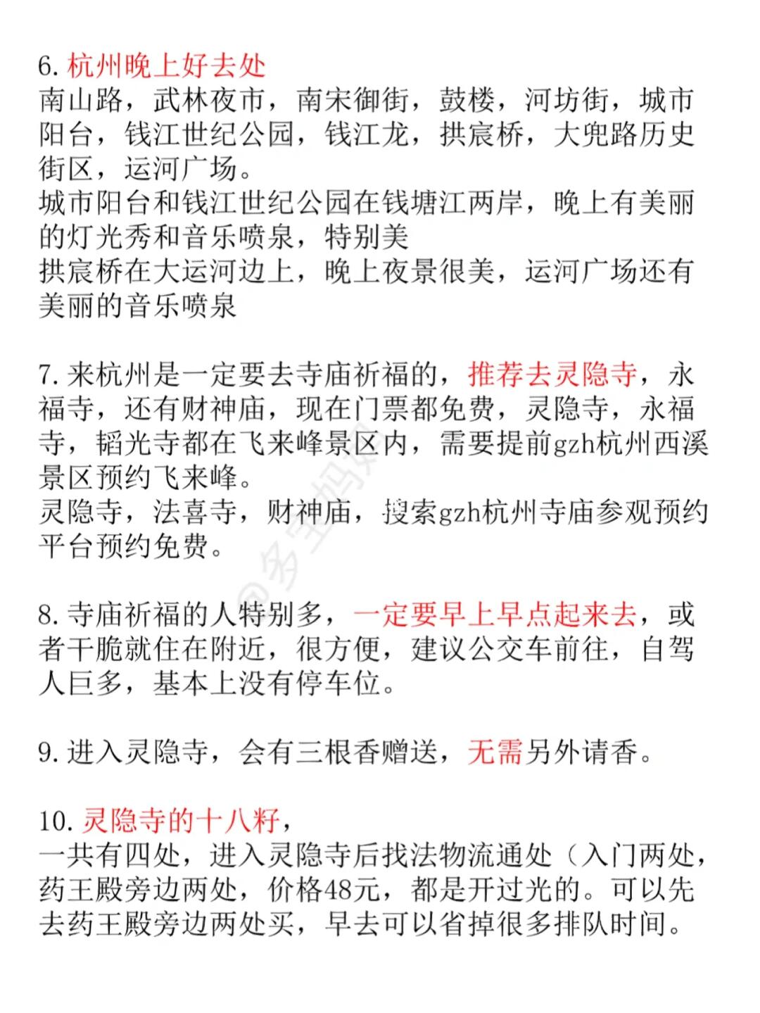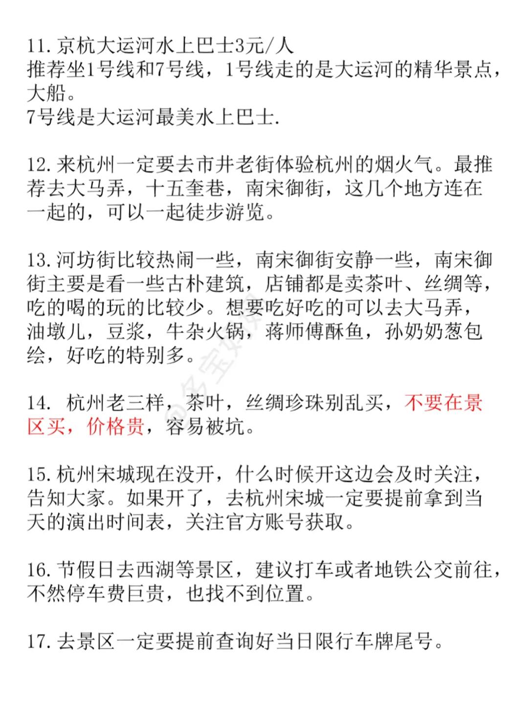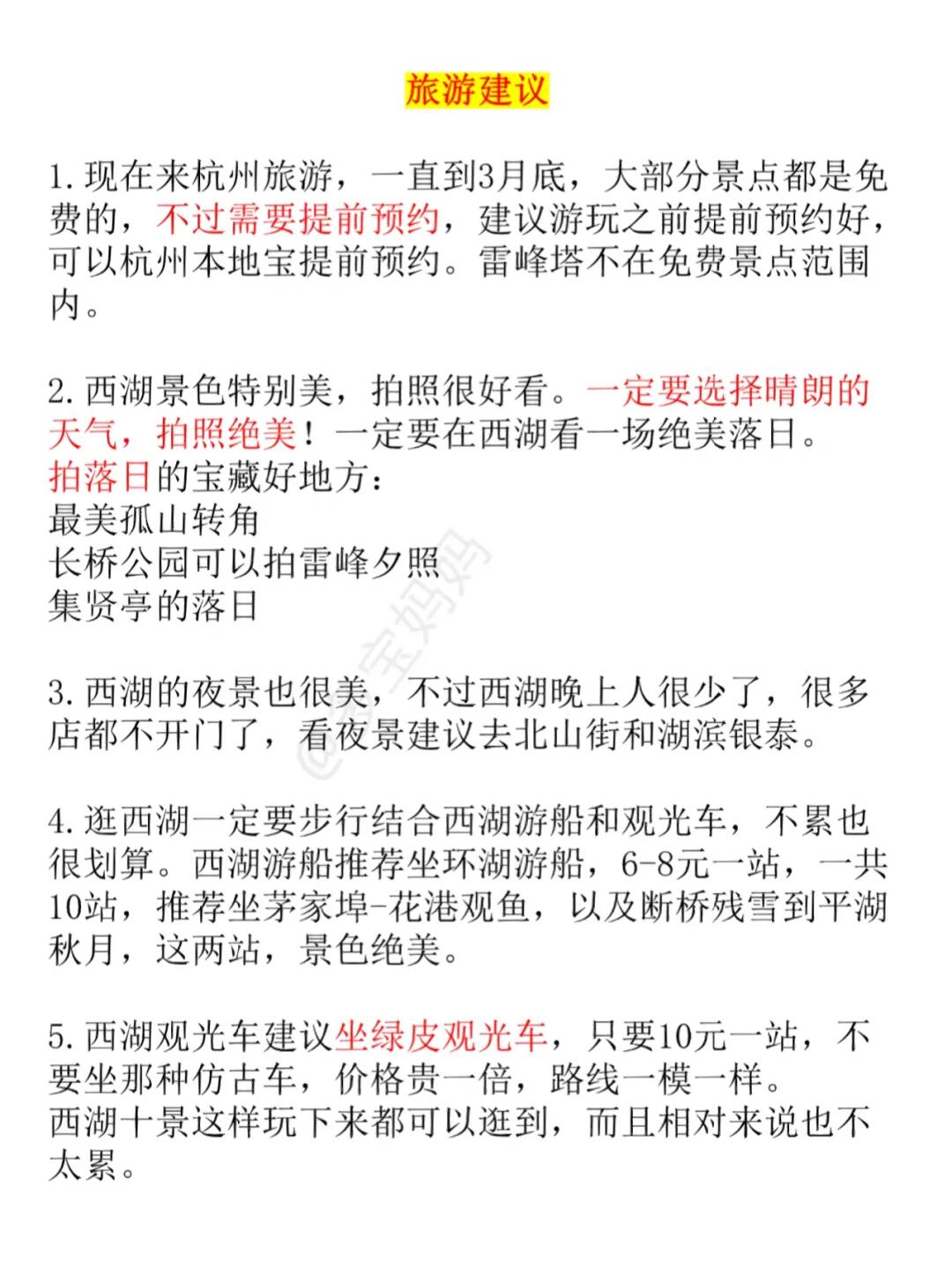 3.节假日去西湖,灵隐寺,千万不要自驾,停车贵也没位置。4.坐西湖观光车一定要选绿皮的,10元一站,比木制的便宜一半