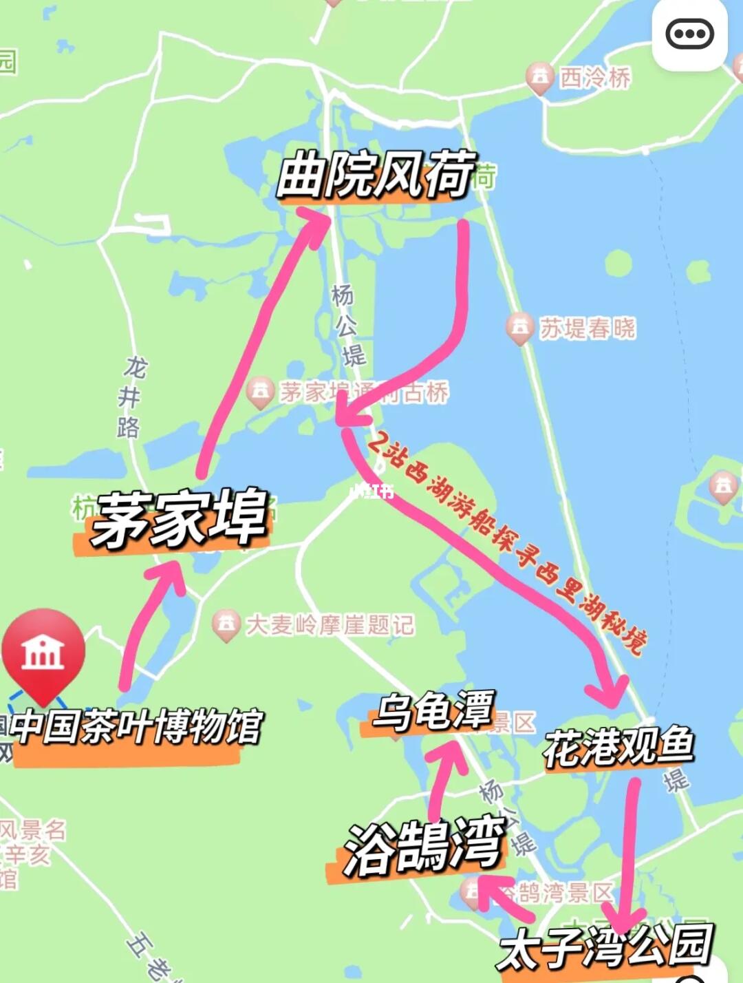 太子湾公园-浴鵠湾-乌龟潭-茅家埠-中国茶叶博物馆-曲院风荷-2站西湖游船-花港观鱼