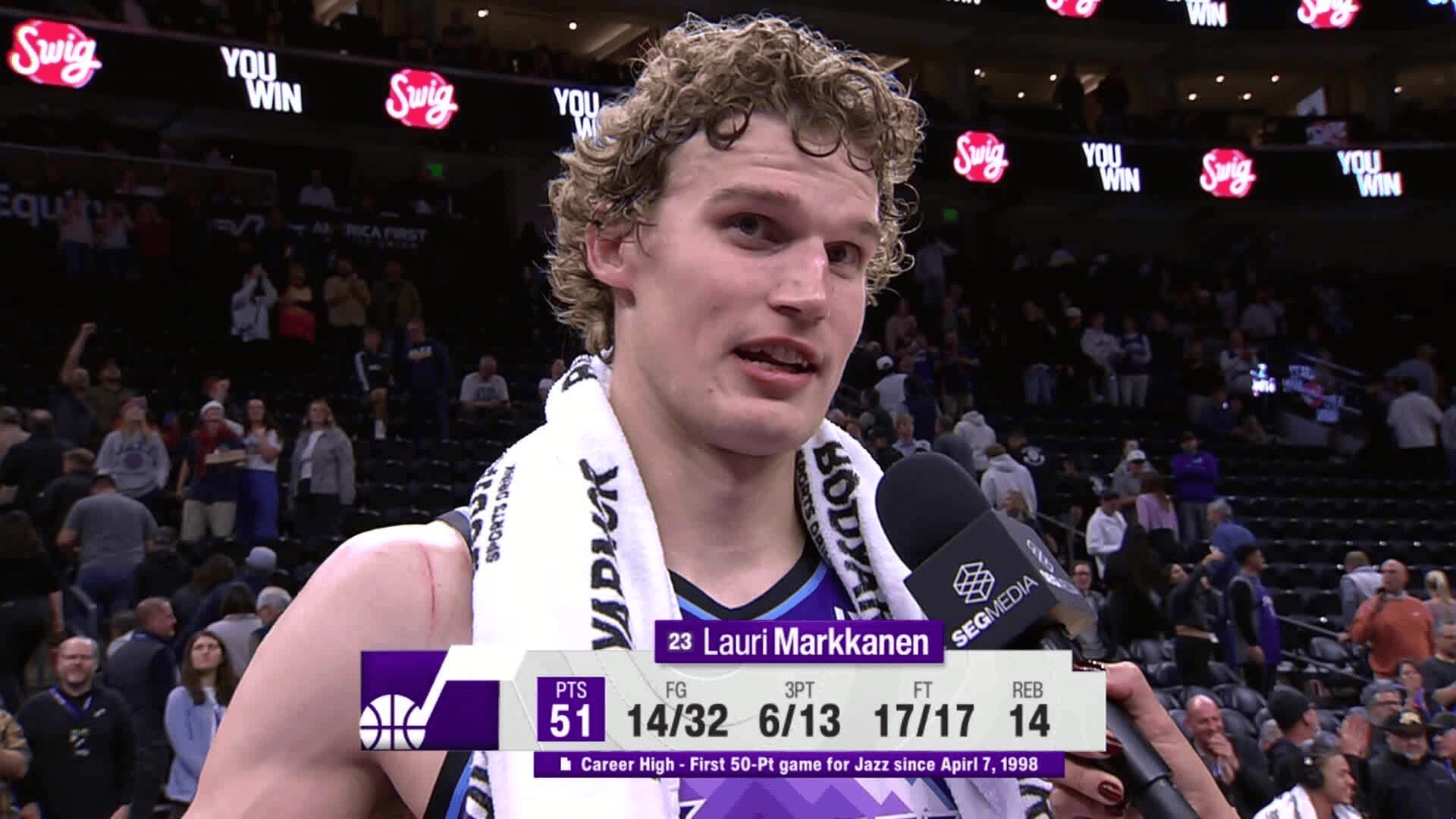 全场比赛,爵士球员劳里-马尔卡宁首发出战45分钟,32投14中,三分球13投6中,罚球17罚17中得到51分14篮板3助攻。