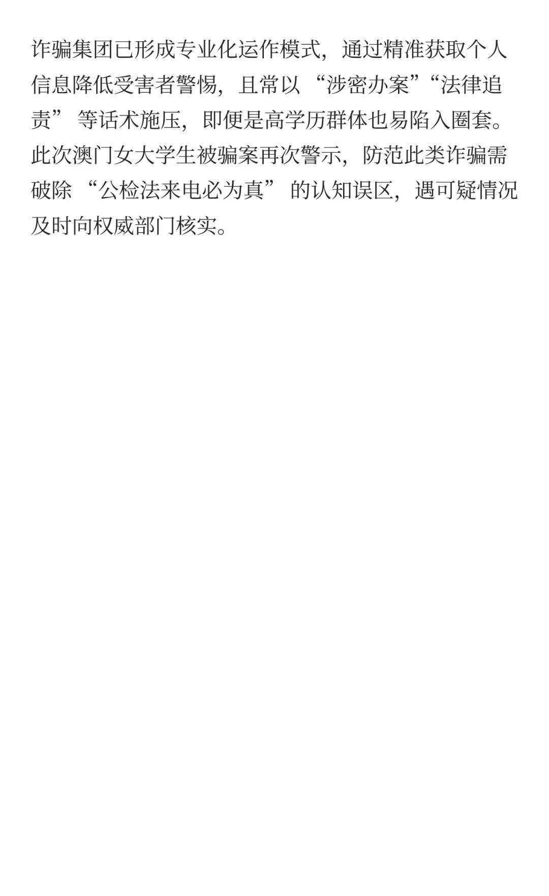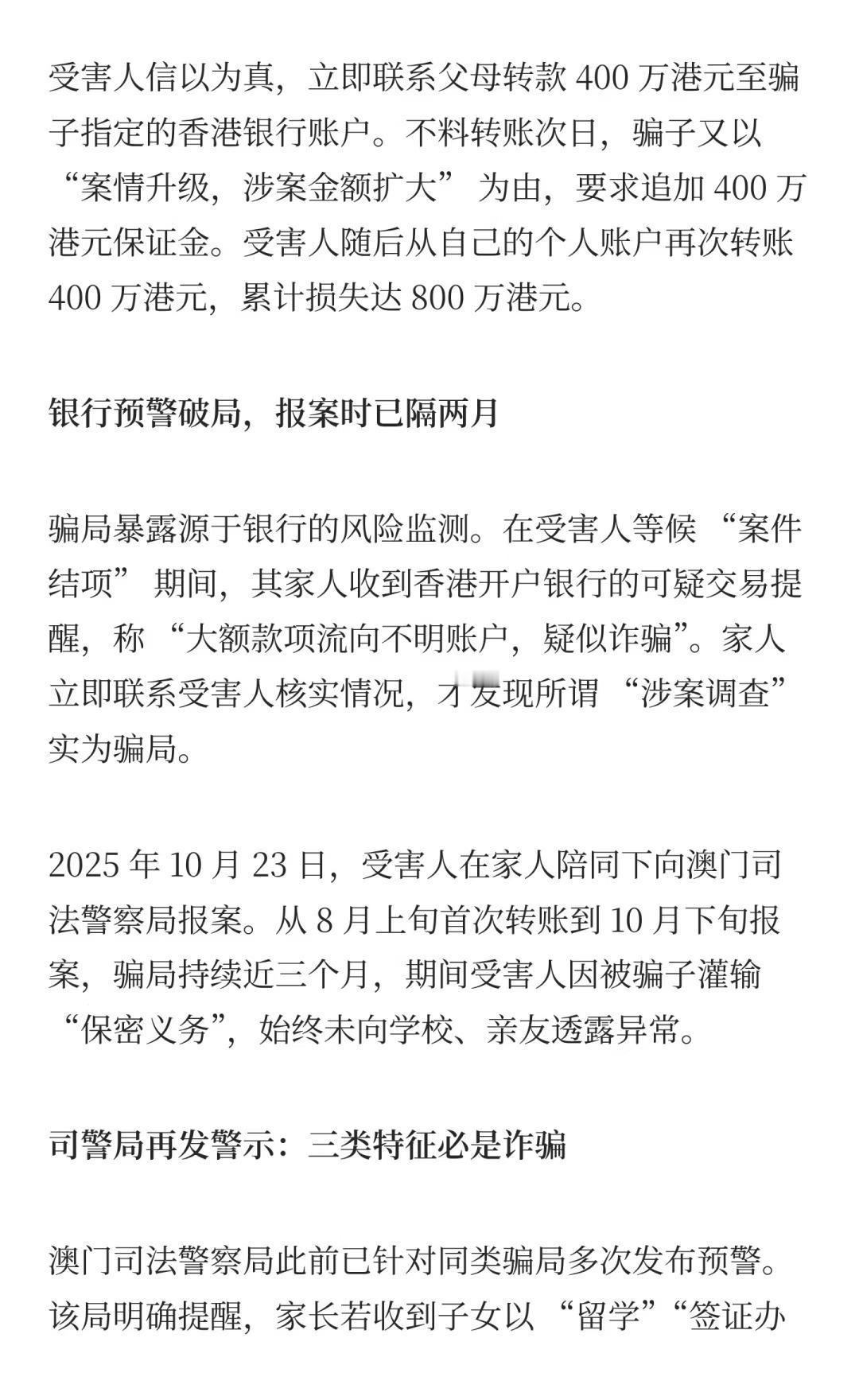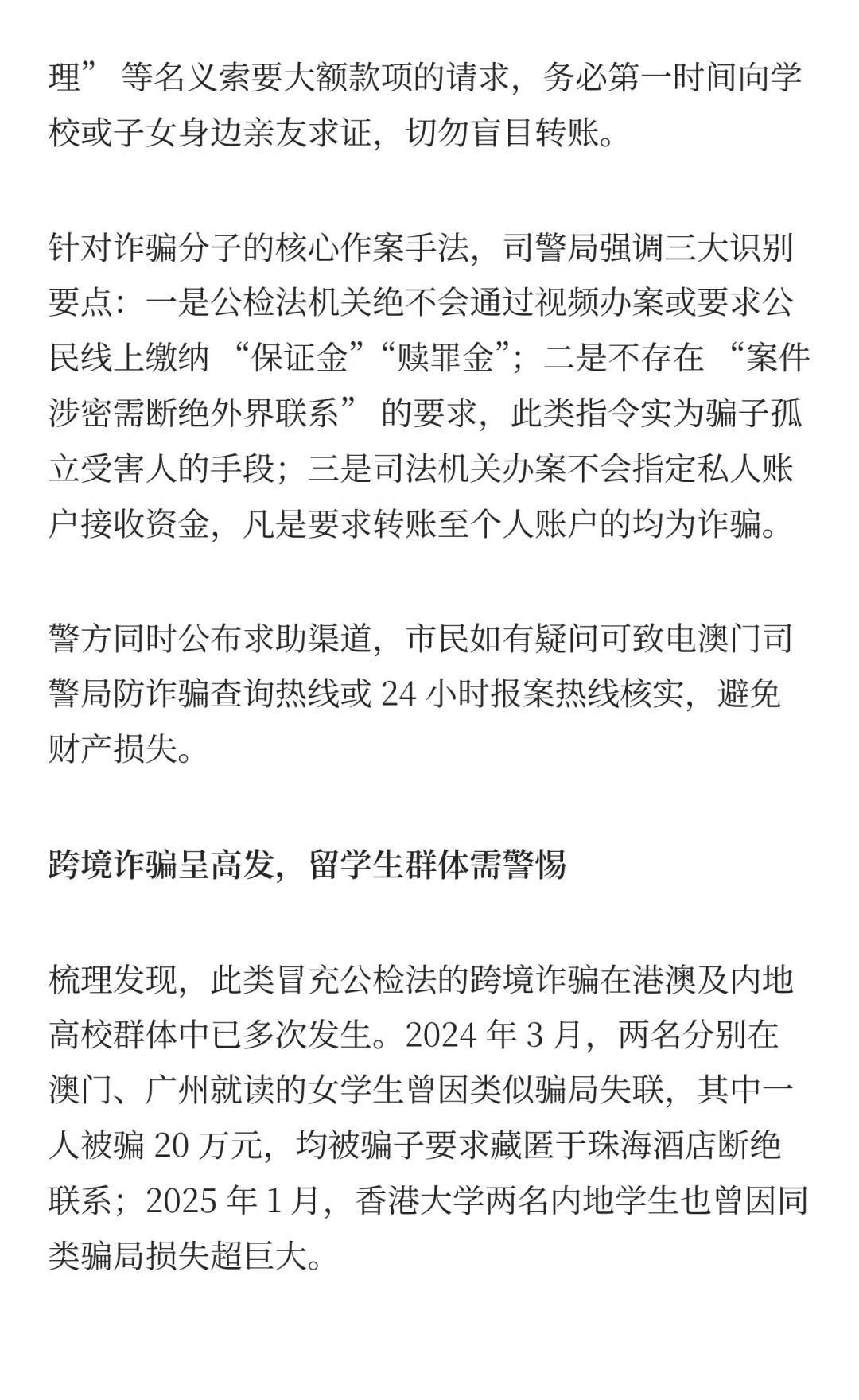 澳门女大学生遭 “假公安” 诈骗 733 万 2025 年 10 月 26 日,据澳门司法警察局通报,一名在澳门就读大学的香港女学生,因误信冒充 “内地公安” 的诈骗分子,先后两次转账共计 800 万港元(约合人民币 733 万元)作为 “案件保证金”,最终在银行风险预警提示下才识破骗局。南都 N 视频记者从澳门司警局证实,该案为近期跨境 “公检法” 类诈骗典型案例,目前警方已立案调查。反诈开学第一课 未成年反诈指南 远离诈骗陷阱 反网络诈骗 反电信诈骗 大学生涉嫌帮信罪 坚决打击犯罪 帮助信息网络犯罪活动罪