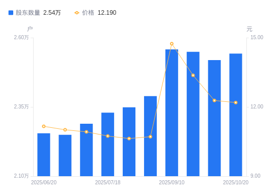 日期A股户数(户)流通A股户均持股数(股)户均持股市值(万元)2025-10-202542436214.7244.152025-09-302519136549.6844.882025-09-192549236118.1148.292025-09-102557536000.9053.072025-08-082389238536.8741.272025-07-312348739201.3941.672025-07-182329239529.5842.452025-07-102289240220.2943.922025-06-302249540930.1245.062025-06-202255140827.4745.56