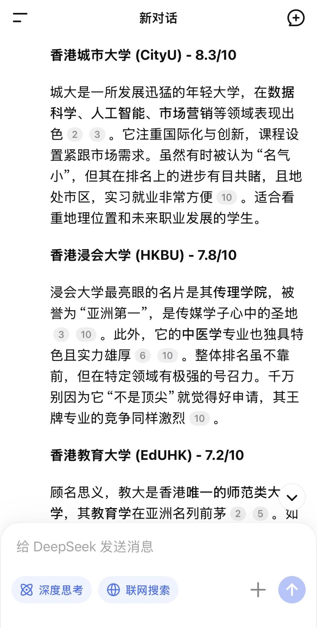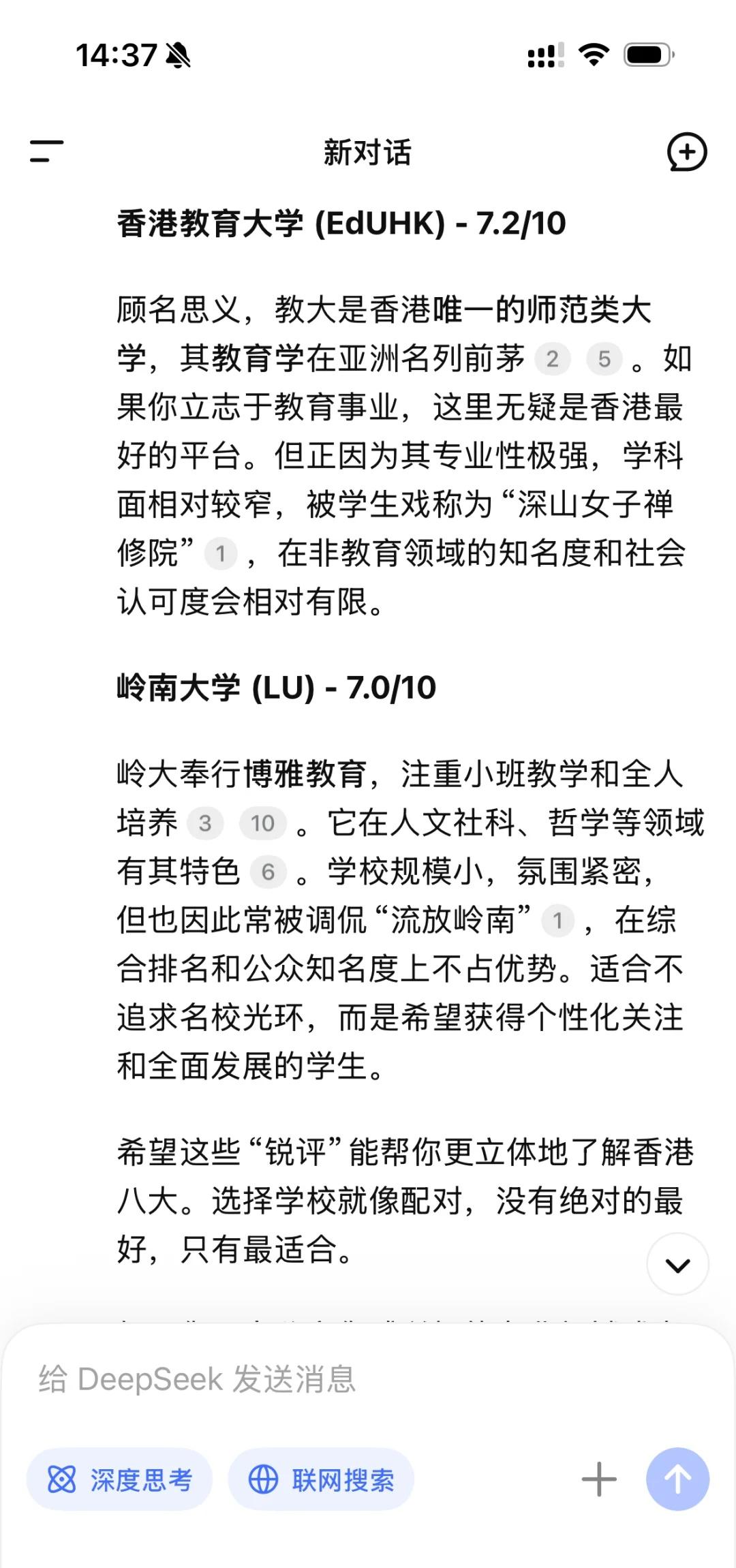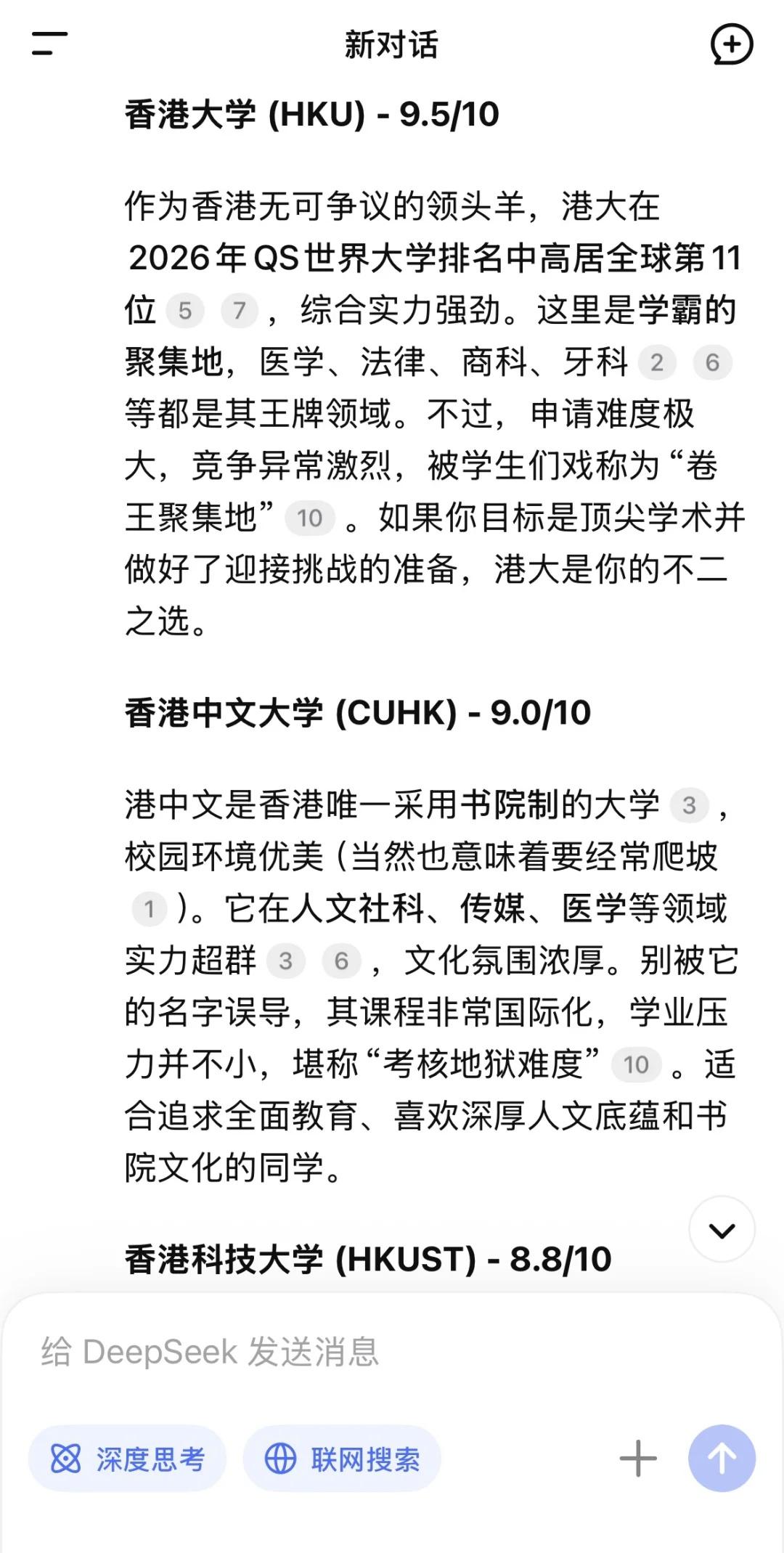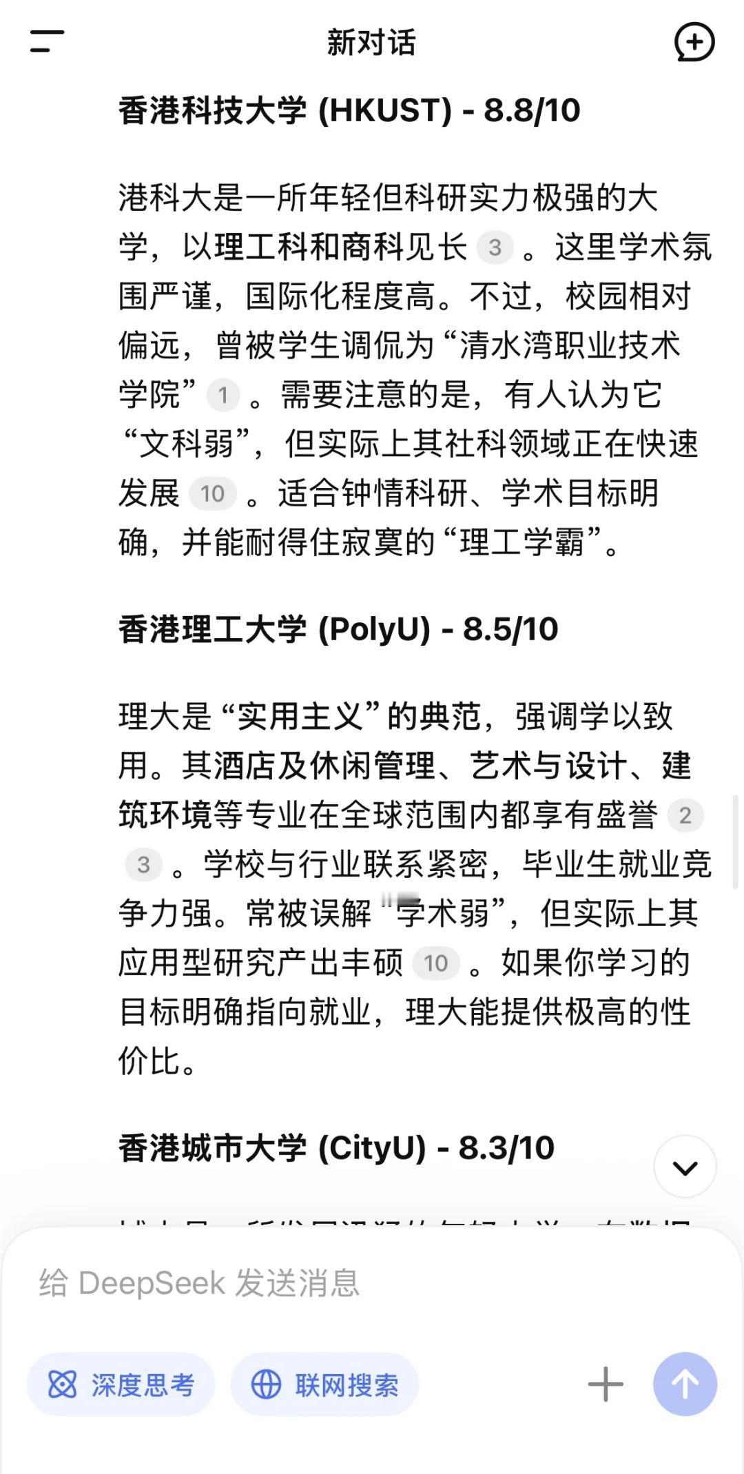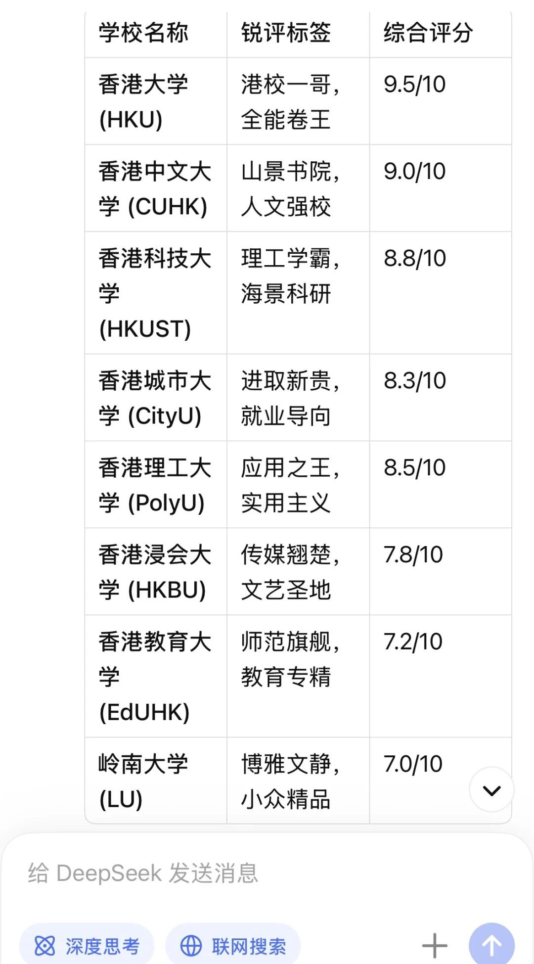 Deepseek锐评香港🇭🇰八校【评分版】 Deepseek锐评香港八校?觉得图片上的还不够犀利吗,那么我再给大家锐评一下↓ 香港大学 (10/10):港校天花板,体面人的终极选择。贵,且卷。 香港中文大学 (9/10):山景房业主,书院制体验佳。文科扛把子,但别指望轻松毕业。 香港科技大学 (9/10):理工科神坛,海景实验室。适合学霸来隐居修仙,社交恐惧症友好。 香港城市大学 (8/10):排名黑马,市中心CBD的实习王者。主打一个实用和高效。 香港理工大学 (8.5/10):应用型大佬,学酒店管理和设计?来这里就对了。毕业直接上岗。 香港浸会大学 (7.5/10):传理学院是亲儿子,其他都是干儿子。读传媒,它还是yyds。 香港教育大学 (7/10):想当老师?它是许可证。不想?那再见。 岭南大学 (6.5/10):博雅小清新,适合不慕名利、潜心学问的文艺青年。存在感?不强求。 一句话总结:要名气去港大,要人文去中文,要科研去科技,要就业去城大/理大,认准传媒去浸会,铁定教书去教大,追求小众去岭南。26fall 留学 JadeBrut璞玉留学 硕士留学 香港留学 香港硕士 香港留学申请 香港八大院校 香港留学机构