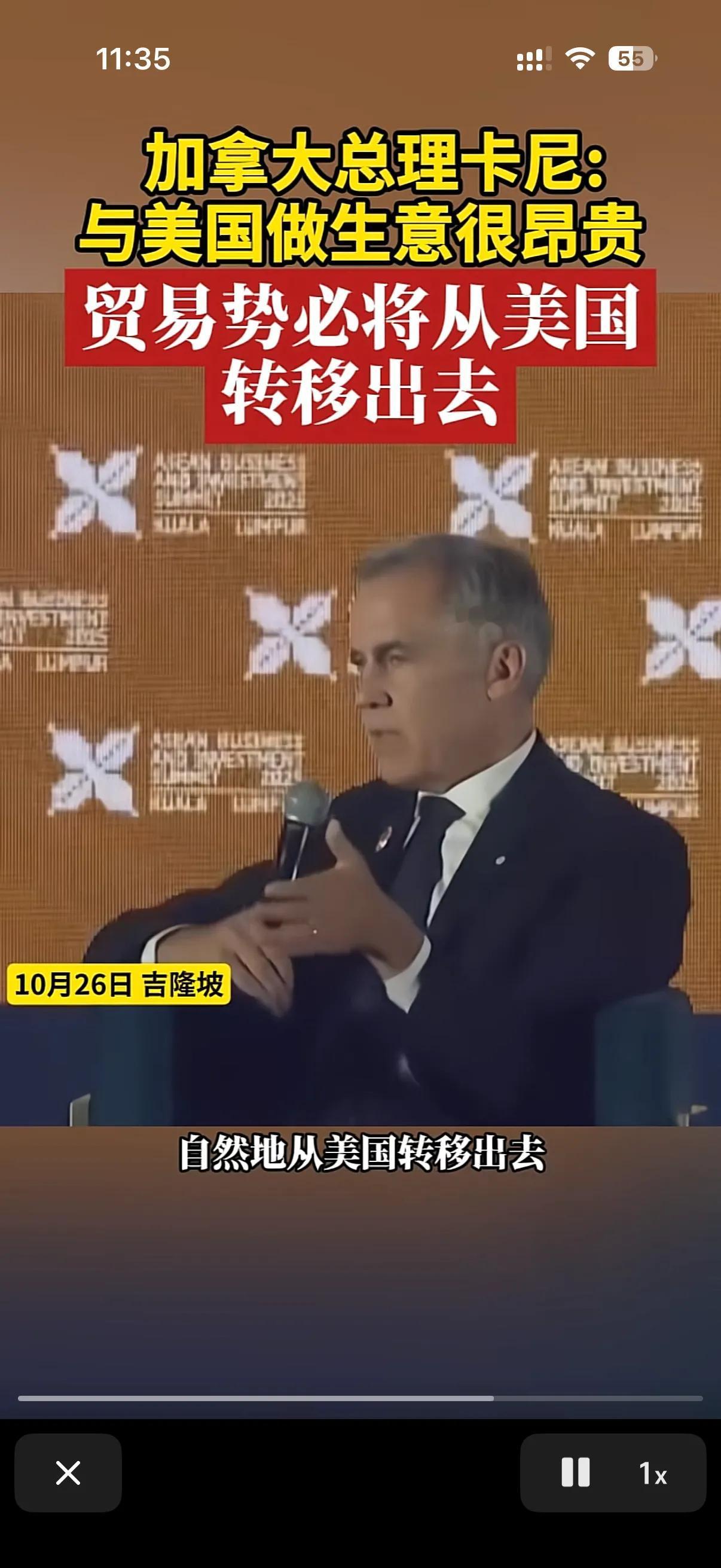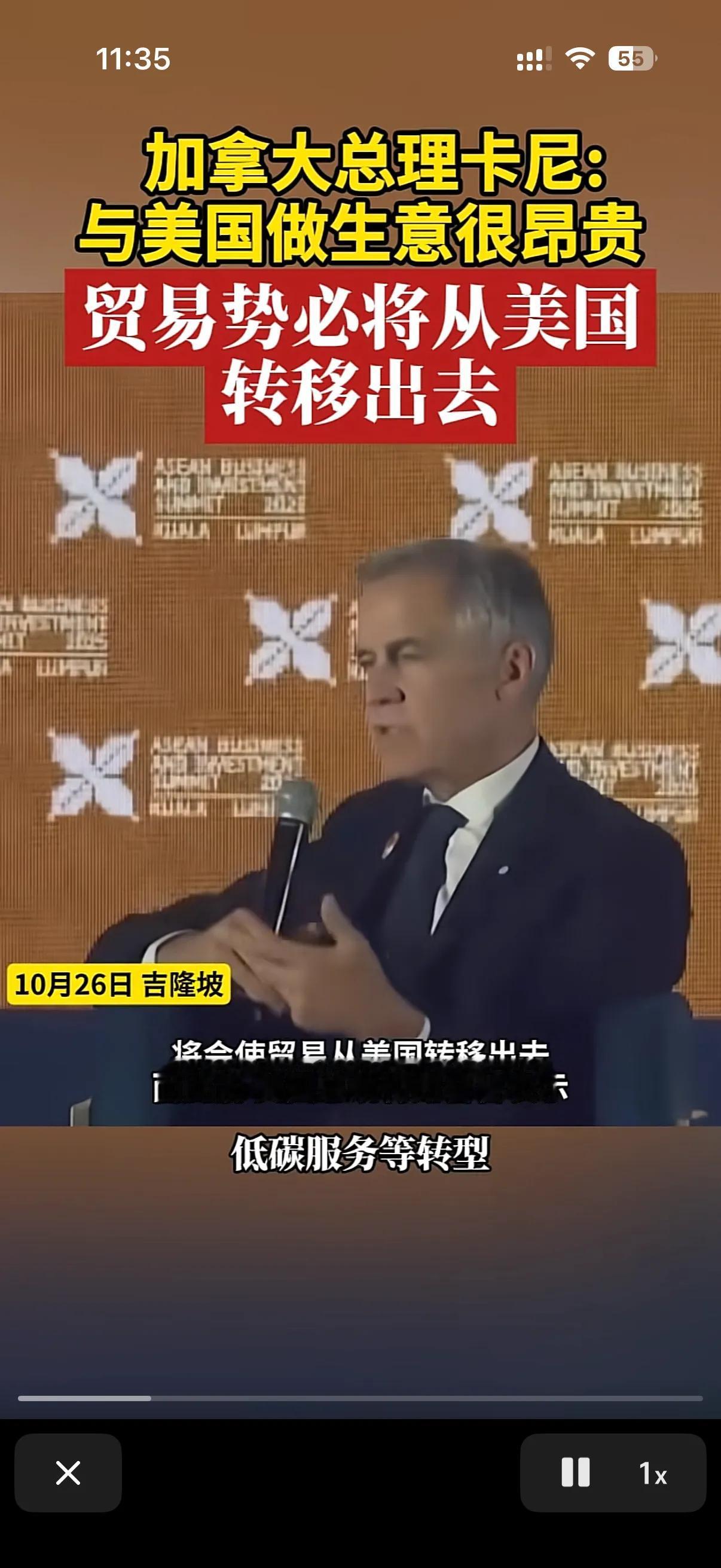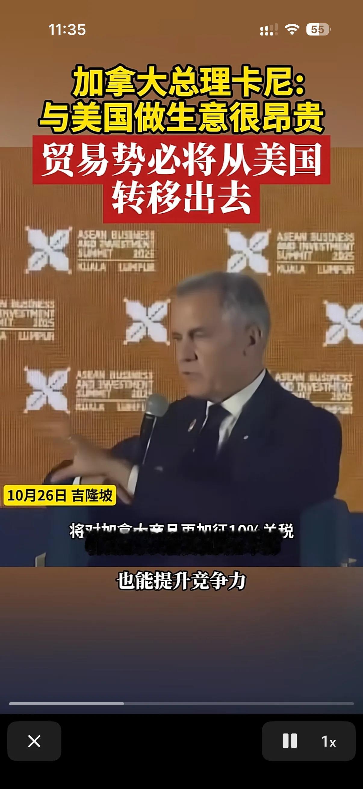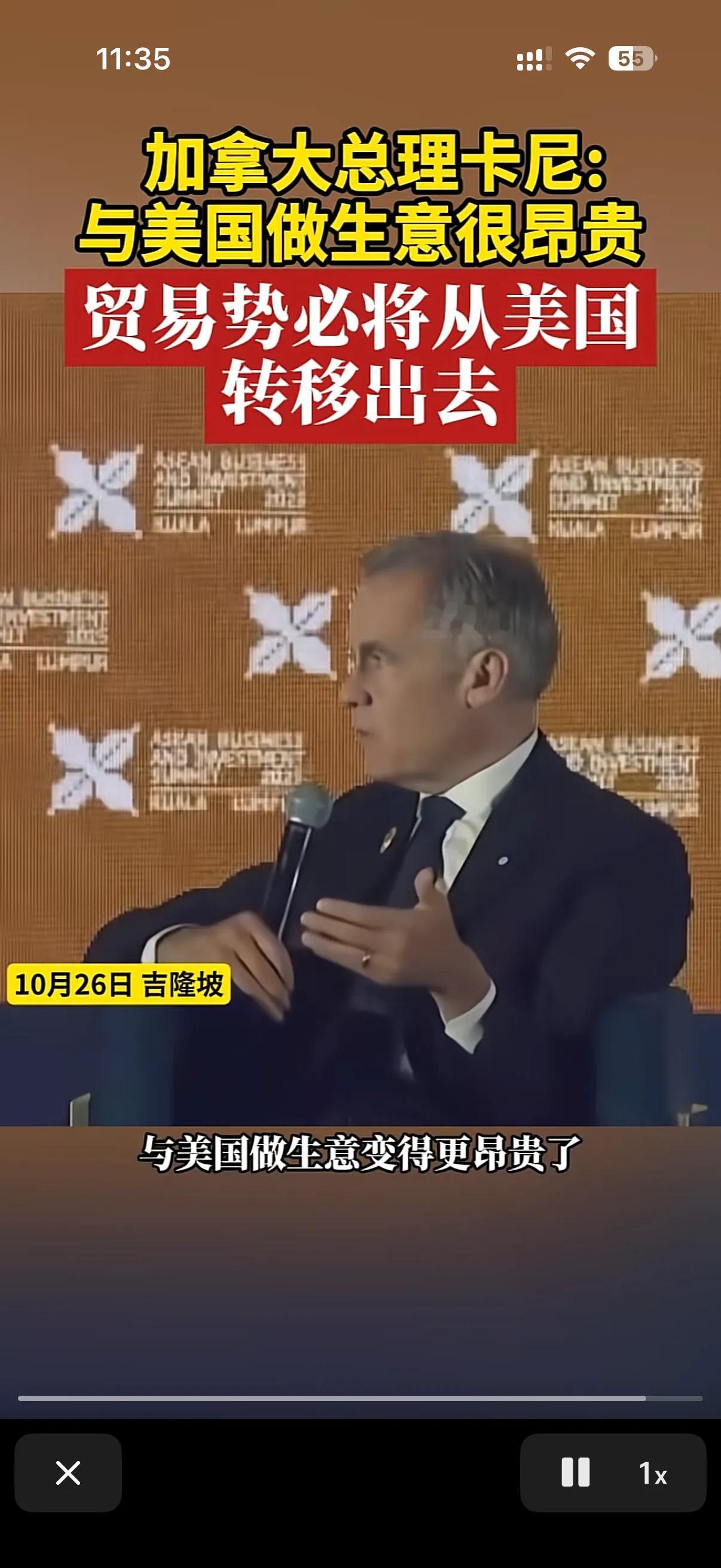 此处不留爷,自有留爷处! 要知道,加拿大一直以来扮演的都是美国忠心小弟的角色! 但是加拿大万万没想到,自己的老大哥美国,自从特朗普上台以后,天就变了,一上台不是变着法的想把加拿大吞并变成美国的一个州,就是给加拿大疯狂增加关税! 前不久加拿大因为发一个反对美国增加关税的广告,直接又让美国对加拿大增加了百分之十的关税! 这下可让加拿大气炸了,我拿你当哥,你拿我当啥! 我跟谁做生意不是做呢,你不是要增加我关税么?现在我离不开你,以后我还离不开你么? 这次在吉隆坡的会议,特朗普和加拿大的总理更是连面都没见! 加拿大总理卡尼称,加拿大的贸易势必要从美国转移出去,因为加拿大与美国做生意成本太高了! 而且现在加拿大国内无论是官员还是民众都对美国和特朗普很不满!