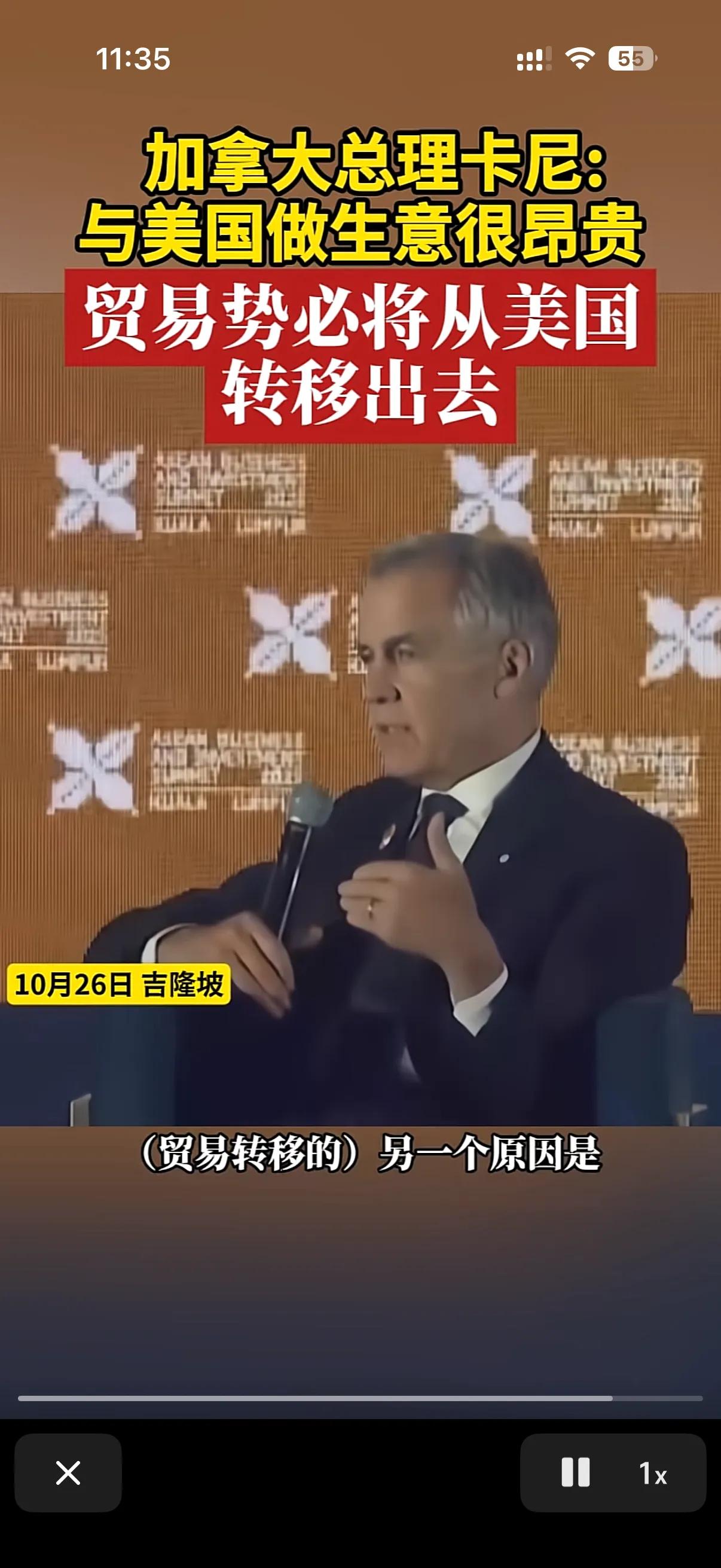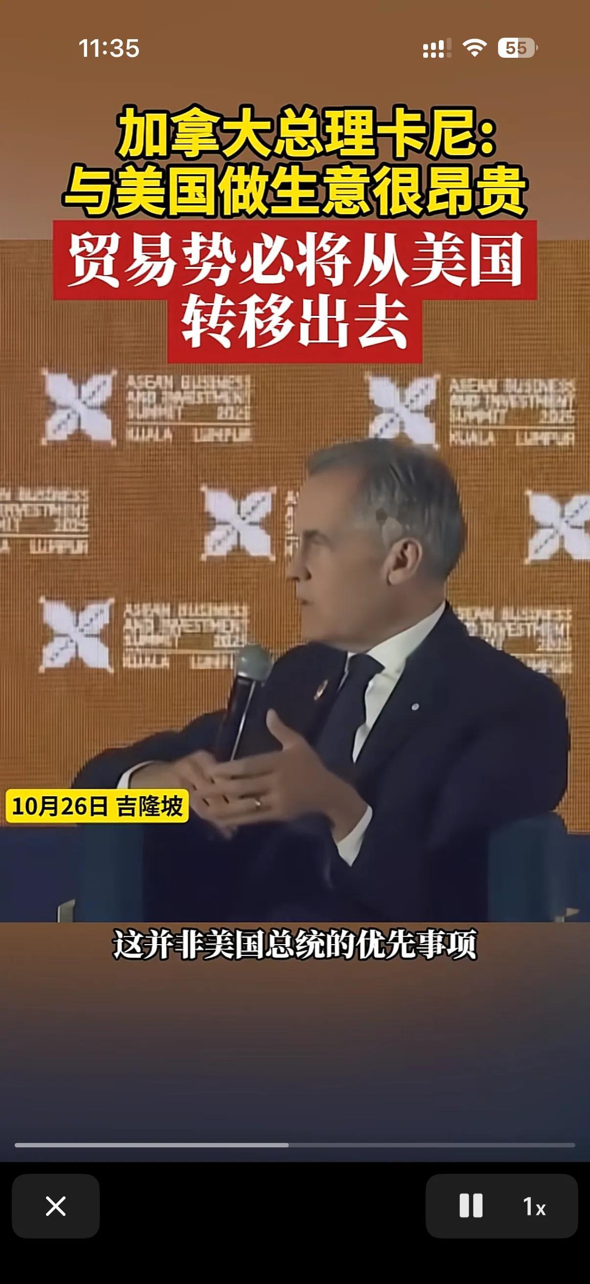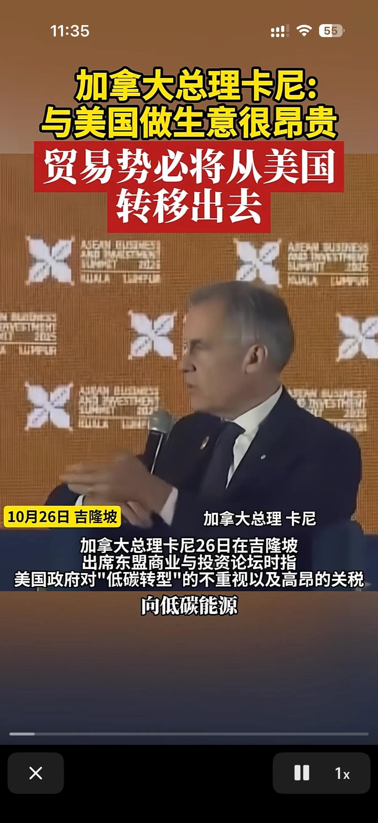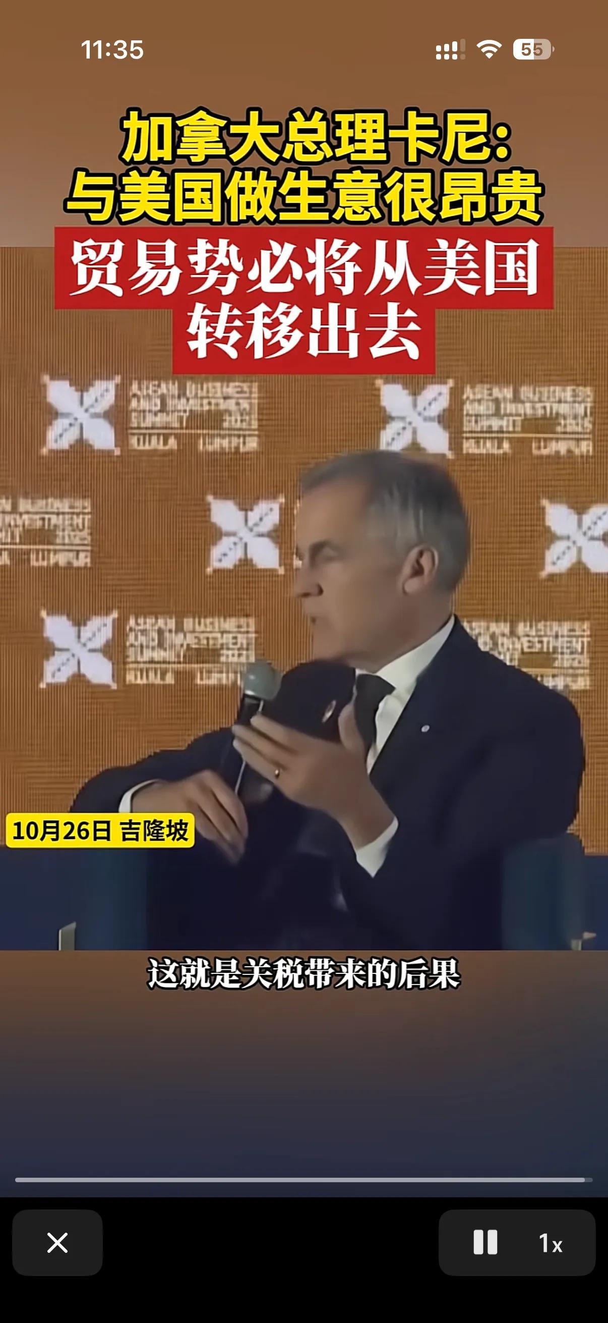 此处不留爷,自有留爷处! 要知道,加拿大一直以来扮演的都是美国忠心小弟的角色! 但是加拿大万万没想到,自己的老大哥美国,自从特朗普上台以后,天就变了,一上台不是变着法的想把加拿大吞并变成美国的一个州,就是给加拿大疯狂增加关税! 前不久加拿大因为发一个反对美国增加关税的广告,直接又让美国对加拿大增加了百分之十的关税! 这下可让加拿大气炸了,我拿你当哥,你拿我当啥! 我跟谁做生意不是做呢,你不是要增加我关税么?现在我离不开你,以后我还离不开你么? 这次在吉隆坡的会议,特朗普和加拿大的总理更是连面都没见! 加拿大总理卡尼称,加拿大的贸易势必要从美国转移出去,因为加拿大与美国做生意成本太高了! 而且现在加拿大国内无论是官员还是民众都对美国和特朗普很不满!