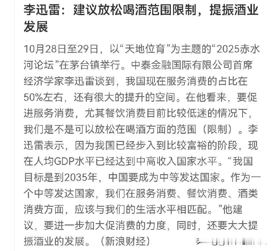 好消息!好消息! 男人的福音来了? 当然也是女人的福音。[捂脸]酒是好东西啊! 这不,著名经济学家李迅雷建议:放松喝酒范围限制,提升酒业发展。 一瓶酒可以带动多少产业链你们知道吗? 根本想不完! 一杯酒下肚,情绪就上来了,还得喝第二杯……俗话说:酒是粮食精,越喝越年轻。 我感觉这个建议挺好的,要不,你看这饭店经常空荡荡的?你们说呢?