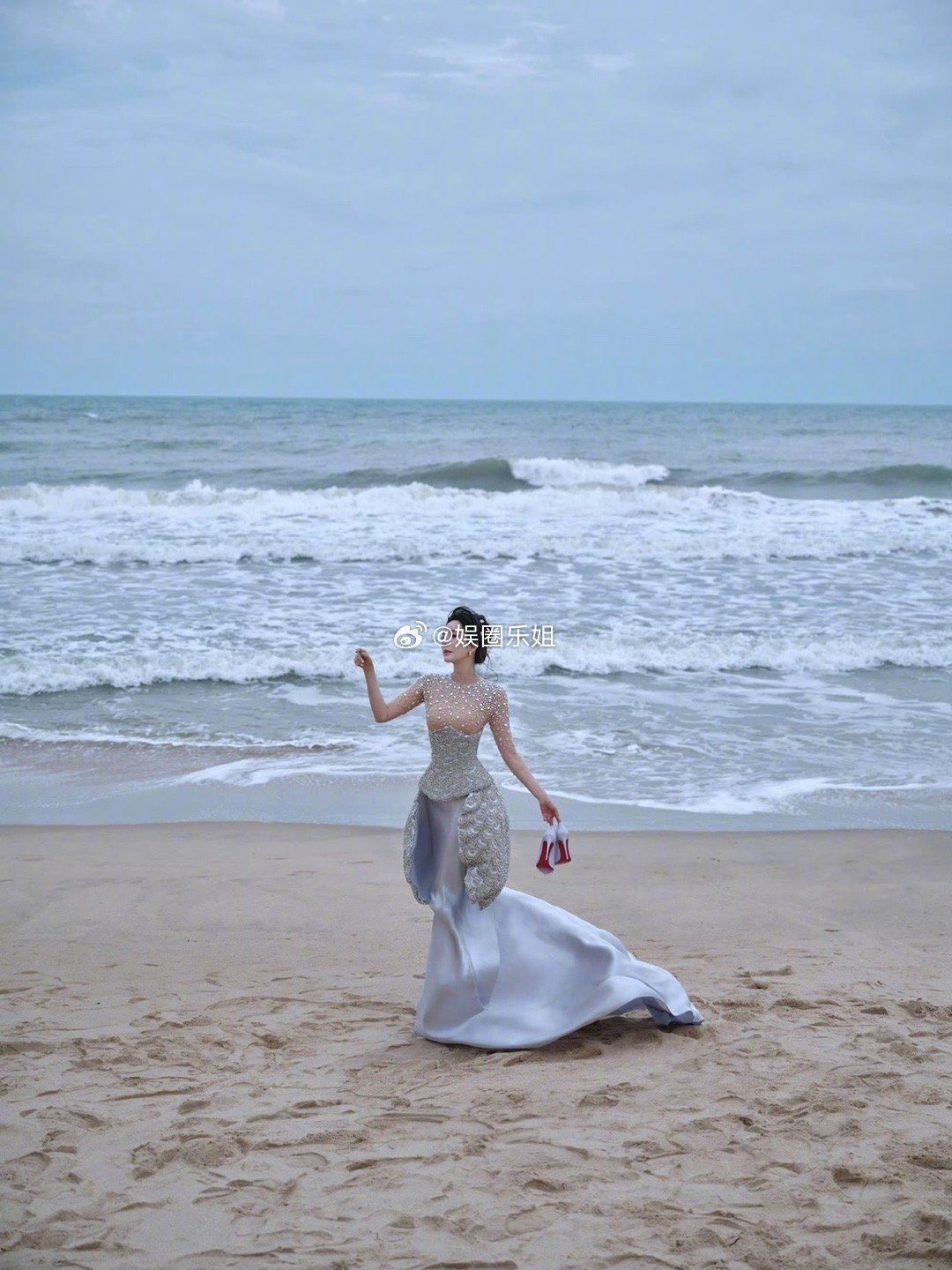 工艺:以深海美人鱼为灵感,采用立体贝壳纹路浮雕工艺,手工缝制耗时数千小时,蓝色基底裙身镶嵌层叠贝壳装饰,光线折射下呈现“波光粼粼”的动态效果。