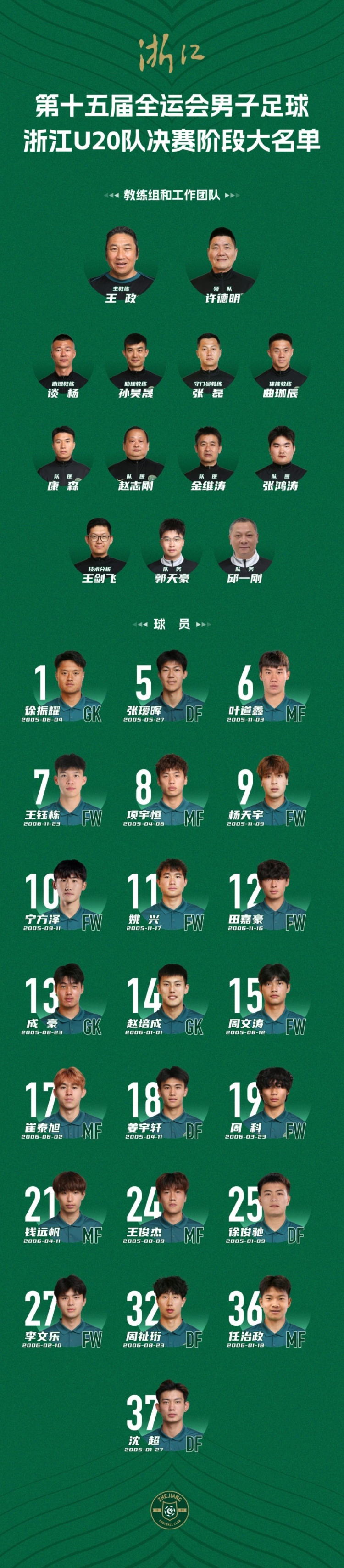 直播吧10月28日讯第十五届全运会即将展开男足U20决赛阶段的较量,浙江队今日公布参赛名单,其中包括了王钰栋和张瑷晖等球员。这支球队将由原浙江绿城主教练王政挂帅,绿城旧将张磊、谈杨担任助理教练。