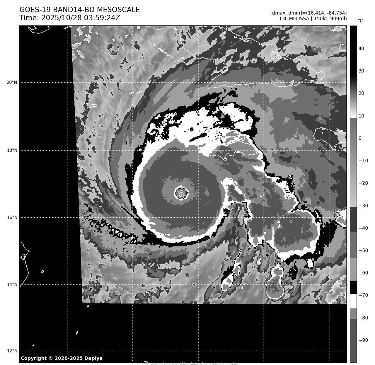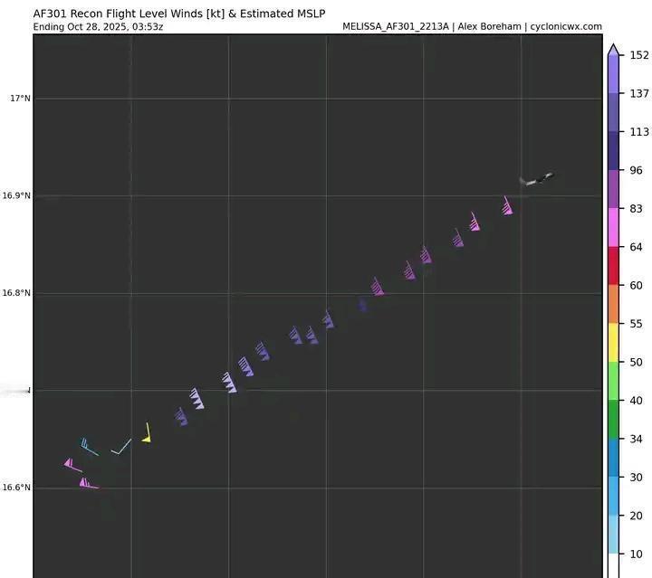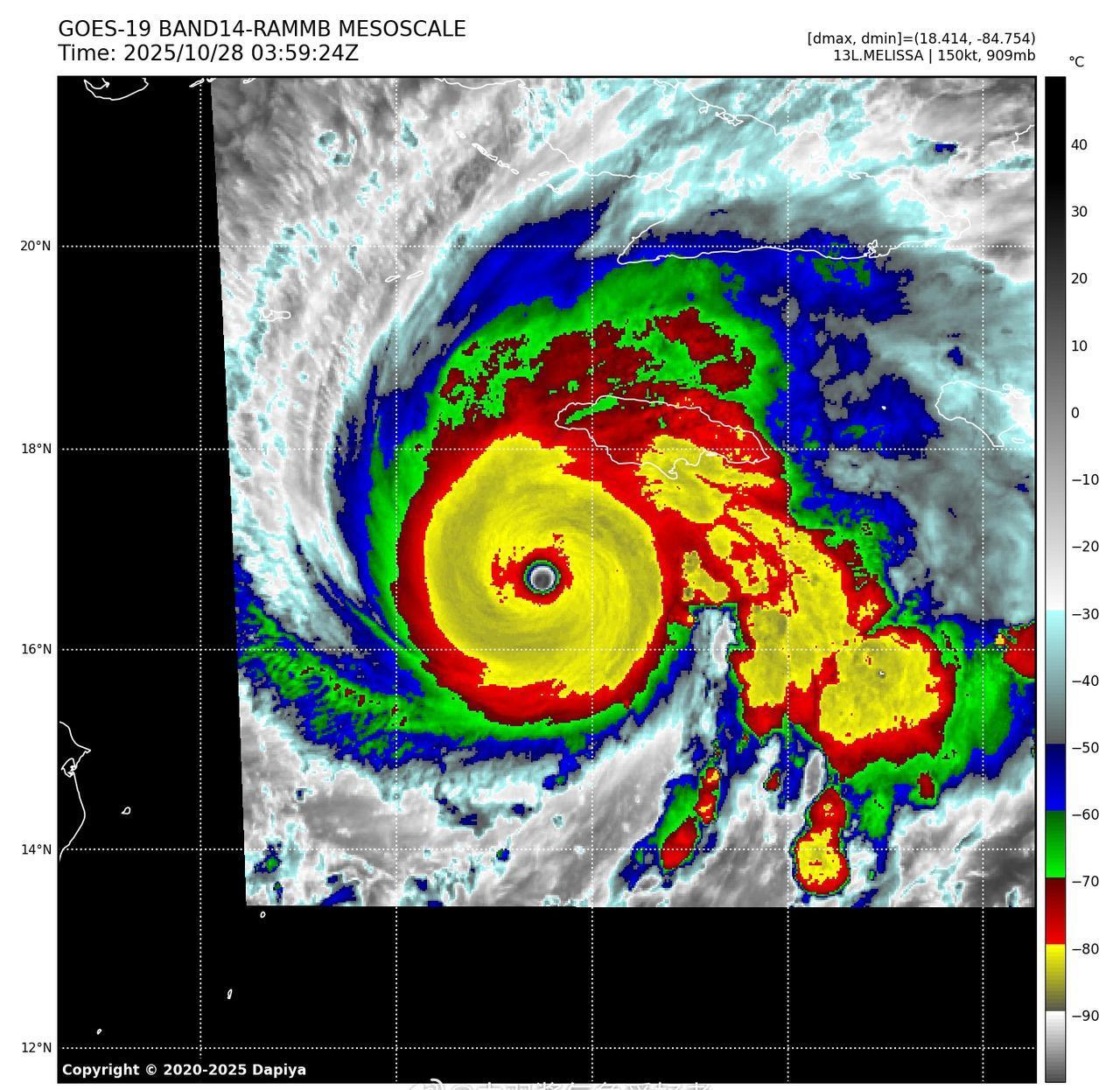 最新的一次实测数据,比较支持150kt的强度,同时中心气压值可推至900hpa附