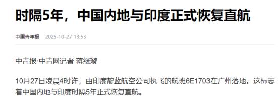 中方和印度同时宣布! 2025年10月27日,印度和中国正式恢复了中断五年的直航航班,首架飞机从加尔各答飞往广州。这次直航重启是由印度最大航空公司靛蓝航空完成的,接下来十一月还会开通新德里到上海和广州的航线。 这五年里两国人员往来和贸易都受了挺大影响。2019年的时候,中印之间每个月还有超过500个航班,印度航空、靛蓝航空还有咱们的国航、南航都在飞。 那时候不管是商务出差还是旅游探亲,都方便得很。可2020年受疫情这些因素影响,直航一停,不光旅客遭罪,旅行成本涨了40%,企业更是苦不堪言。 就说印度的原料药和长绒棉这些主要出口货,以前直航的时候能直接运过来,断航后得先拉到香港转关,光物流费就占了货值的8%,这笔额外开支让不少印度商家心疼坏了。 现在直航一恢复,这些麻烦事一下就解决了,物流成本直接降了近三成,对两国贸易的拉动立马就显出来了。其实早有苗头,2024年中印贸易额就超过了印美贸易,中国重新成了印度最大的贸易伙伴。 到2025年9月,印度从中国进口的货涨了16%,往中国出口的更猛,直接飙了34%,这直航简直是给两国贸易踩了油门。 更关键的是,这事不是临时决定的,是两国高层达成共识后的落地。咱们外交部都说了,这是落实两国领导人天津会晤的约定。除了直航,边境管控也有新进展。 就在这个月排灯节的时候,中印边境的士兵还互相递了糖果。这氛围跟几年前的紧张劲比,完全是两个样,看得出来两国都想往缓和的方向走。 而且这只是个开始,接下来十一月还有更密集的航线计划。靛蓝航空要开通新德里到广州的航线,打算每天飞一班,另外新德里到上海的航线也在准备中。 咱们中国东航也没闲着,11月9号起就要恢复上海往返德里的航线,每周三、周六和周日各飞一班,现在机票都已经开始卖了。懂行的人都预测,照着这个势头,用不了多久,中印之间的航班数量说不定能恢复到以前每月500架次的水平。 以后北京、成都、昆明这些城市,说不定还会和印度的孟买、班加罗尔开通直航,毕竟这些地方都是两国贸易和文化的核心枢纽。 这事最坐不住的要数美国了。之前美国一直喊着“中印必冲突”,想把印度绑在遏华战车上。可现在两个加起来快30亿人的大国,用贸易和人文交流代替了对抗,直接让美国的算计落了空。 最近美国参议员鲁比奥急着给莫迪解释,说美印关系不动摇,可实际行动却挺诚实——给巴基斯坦的商品关税才19%,给印度却是50%,理由就是印度买俄罗斯的石油。 莫迪心里门清,印度三分之一的原油都从俄罗斯买,每桶比美国的油便宜15美元,要是换成美油,炼油厂成本涨了,最后还得老百姓买单。就算美国上个月制裁了俄罗斯两大石油公司,印度国有炼油厂还是悄悄找中间商继续买,就是不想被美国卡脖子。 更让美国尴尬的是,他们刚和巴基斯坦签了关键矿产协议。巴基斯坦的铜、锑储量在南亚排第一,这些都是美国想摆脱对华依赖急需的资源。可这事美国事先都没跟莫迪打招呼,直到现在才来解释,明显是没料到莫迪会这么强硬。 这次东盟峰会,莫迪干脆没去,只派外长苏杰生见了鲁比奥。苏杰生只说“会谈愉快”,压根没提美巴合作和俄油的事。这模糊的表态其实就是态度——印度不想丢了中印合作的好处。 毕竟中国能给印度98.5%的进口工业品,能通过直航帮印度企业降成本,这些美国根本给不了。 这直航恢复哪是什么简单的航空新闻,分明是两个大国用实际行动选了合作共赢。从加尔各答起飞的航班上装着的原料药,到广州机场里旅客轻松的笑容,再到边境线上互赠的糖果,这些细节都在说明,不管外界怎么煽风点火,发展才是两国最实在的需求。 印度要贸易增长、就业稳定,咱们也需要更顺畅的国际合作,这种攥在手里的实惠,比任何“战略合作”的口号都管用。 接下来随着新德里到上海、广州的航线开通,两国的人文交流肯定会更热络。虽然现在印度对中国公民的旅游签证办理还比以前复杂,存款证明从1万提到了10万,电子签证通道也没恢复,但能重启直航本身就是个重要的开始。 等后续政策再逐步完善,简化签证流程,说不定很快就能看到更多中国游客去印度看泰姬陵,更多印度游客来中国逛故宫,两国的生意人、留学生往来也会越来越频繁。 这事给美国也提了个醒,在南亚搞“拉一个、压一个”的老套路早就行不通了。国家之间的合作从来不是靠地缘博弈能套牢的,谁能解决真问题,谁能给老百姓带来实惠,谁才能真正赢得认可。 当加尔各答至广州的航班平稳降落,当两国贸易数据持续攀升,美国那些所谓的“解释”和遏华算计,早就成了无关紧要的背景音。而中印直航的重启,不仅会让两国关系走得更稳,更能为亚洲乃至世界的和平繁荣添把力。