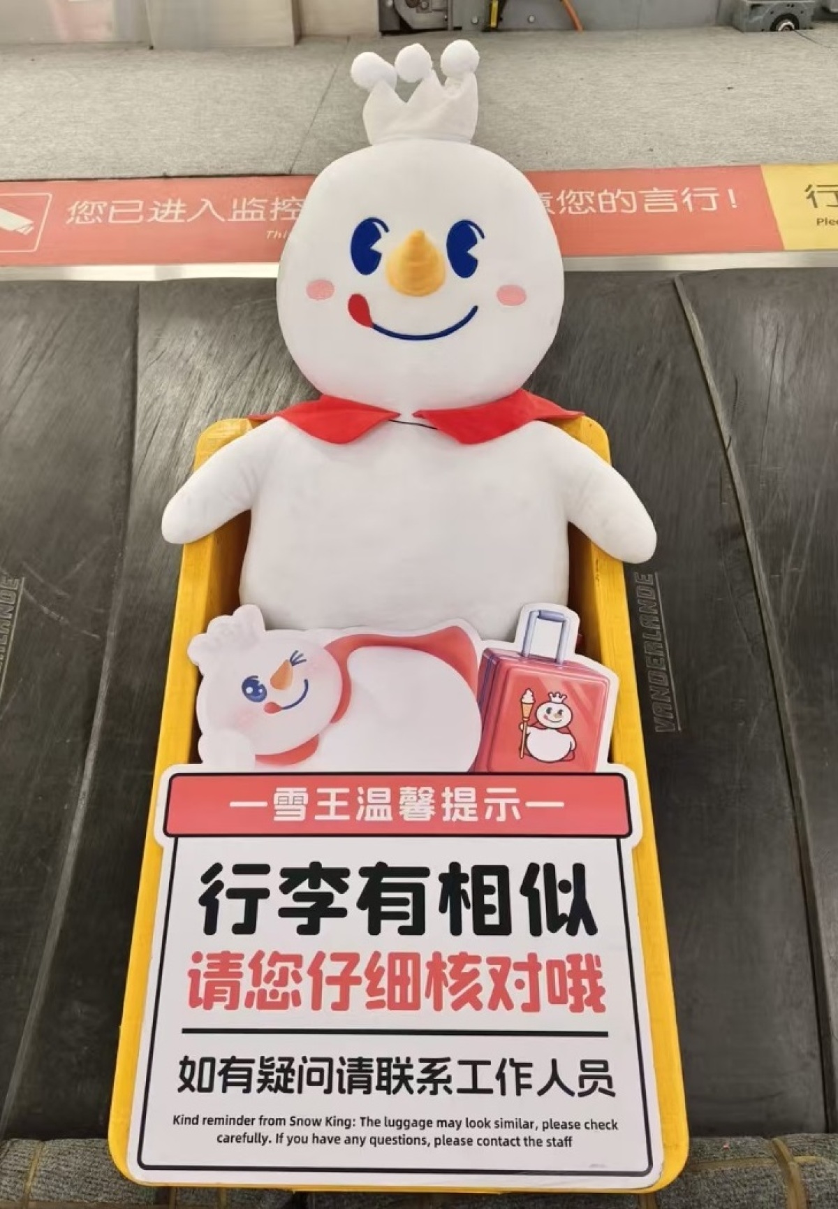 在郑州机场到达大厅行李转盘上,雪王化身服务人员,手拿提示牌,向来往的旅客提醒到:“行李有相似,请仔细核对哦”。现场旅客表示这个雪王很引人瞩目,这样的提醒方式很有趣、很贴心,有效避免顾客因行程匆忙或行李外观相似导致的误拿问题。