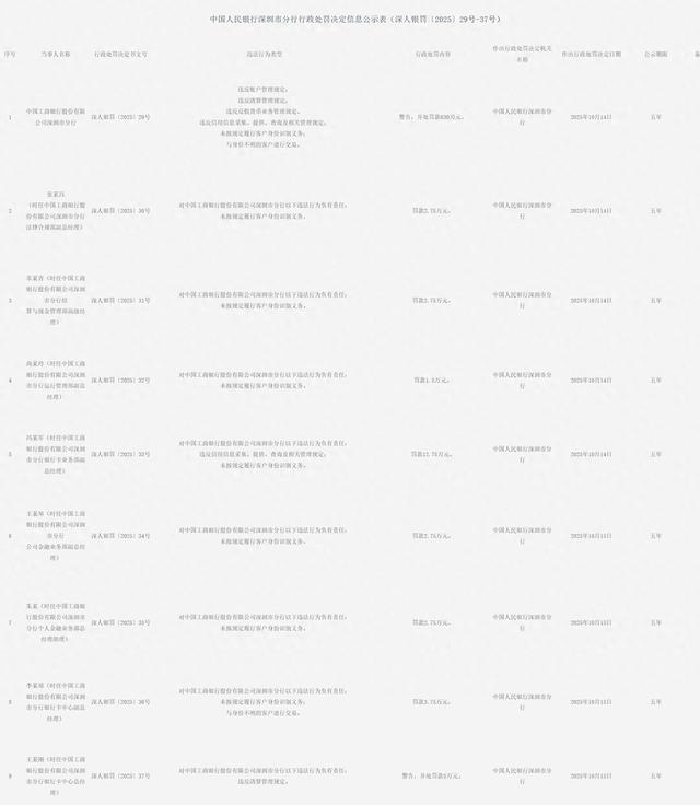 信网10月28日讯近日,中国工商银行股份有限公司深圳市分行因多项违法行为被中国人民银行深圳市分行处以630万元罚款,同时8名相关责任人分别受到警告或罚款处罚。