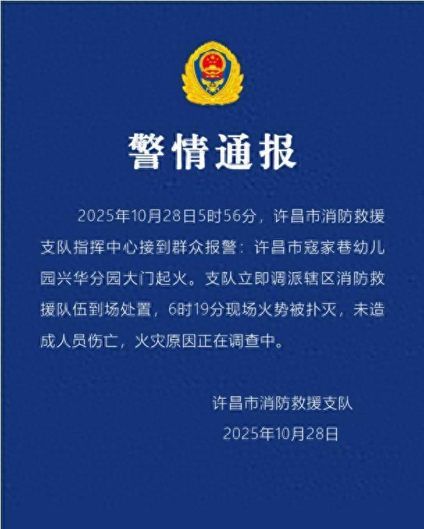 2025年10月28日5时56分,许昌市消防救援支队指挥中心接到群众报警:许昌市寇家巷幼儿园兴华分园大门起火。支队立即调派辖区消防救援队伍到场处置,6时19分现场火势被扑灭,未造成人员伤亡,火灾原因正在调查中。