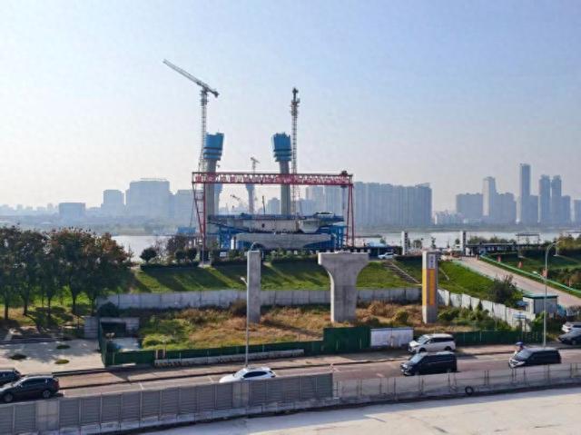 安徽建工水利蚌埠市延安路大桥及接线工程项目部现场负责人陈建坤介绍,延安路大桥全长2733米,主跨420米,是目前淮河流域主跨最大的双塔斜拉桥,造型融入“蚌型”意象,是蚌埠“拥河发展”战略的重要工程。目前已进入主桥面钢箱梁焊接安装阶段,北岸引桥已施工完工,正在进行路面施工,预计2026年贯通。