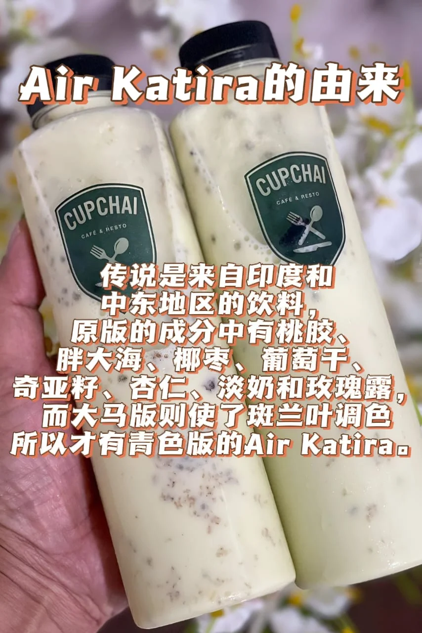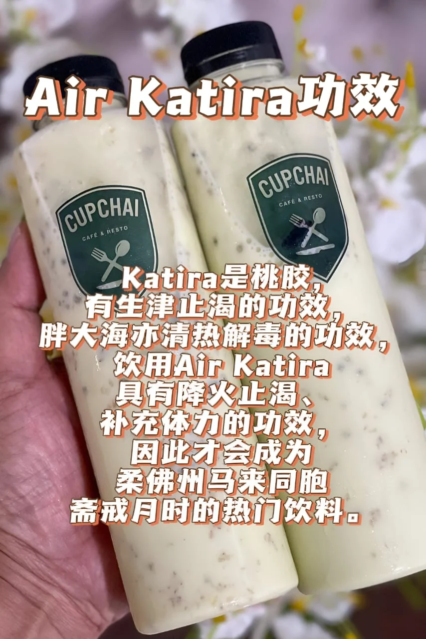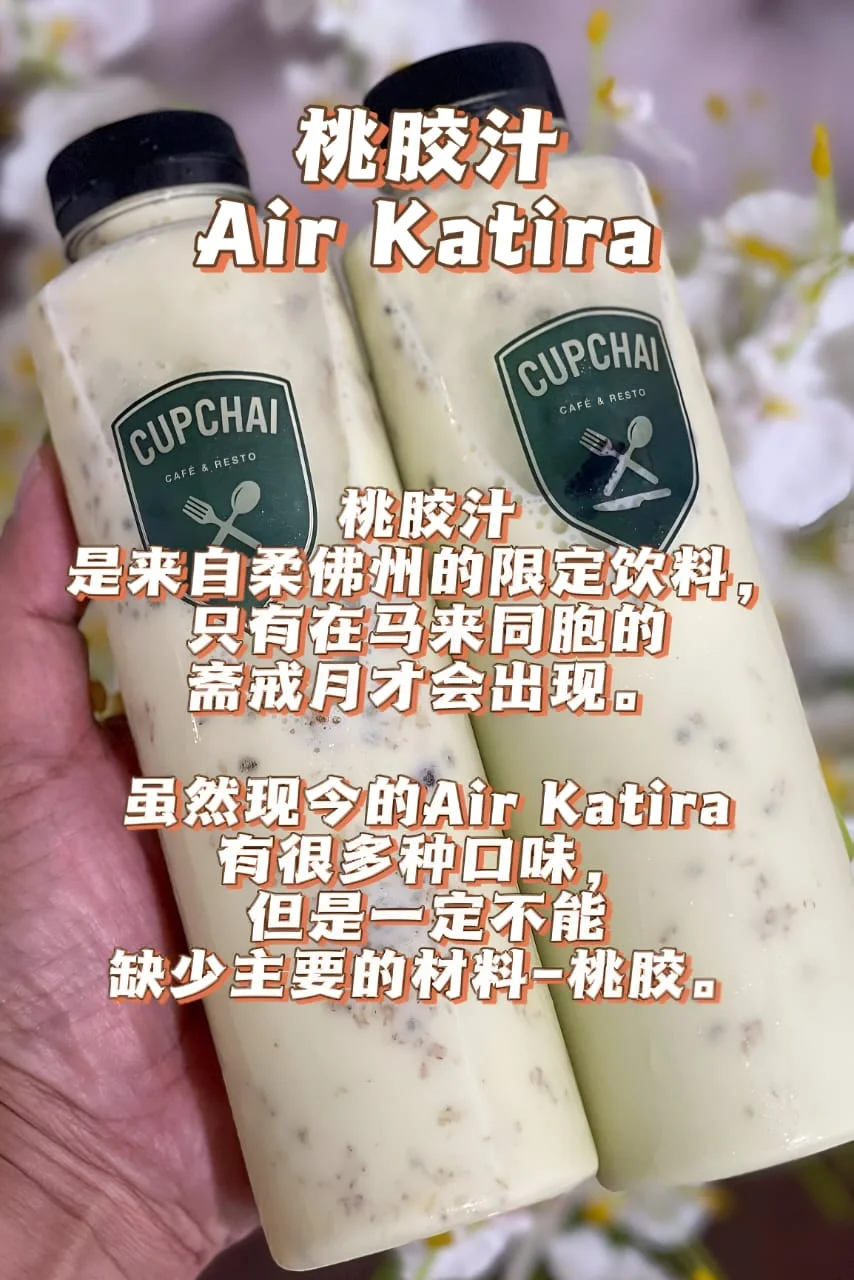 桃胶汁(Air Katira)是来自柔佛州的限定饮料,只有在马来同胞的斋戒月才会出现。 虽然现今的Air Katira有很多种口味,但是一定不能缺少主要的材料-桃胶。 🗯️Air Katira来源 传说是来自印度和中东地区的饮料,原版的成分中有桃胶、胖大海、椰枣、葡萄干、奇亚籽、杏仁、淡奶和玫瑰露,而大马版则使了斑兰叶调色,所以才有青色版的Air Katira。 🗯️Air Katira的功效 Katira是桃胶,有生津止渴的功效,胖大海亦清热解毒的功效,饮用Air Katira具有降火止渴、补充体力的功效,因此才会成为柔佛州马来同胞斋戒月时的热门饮料!🥤