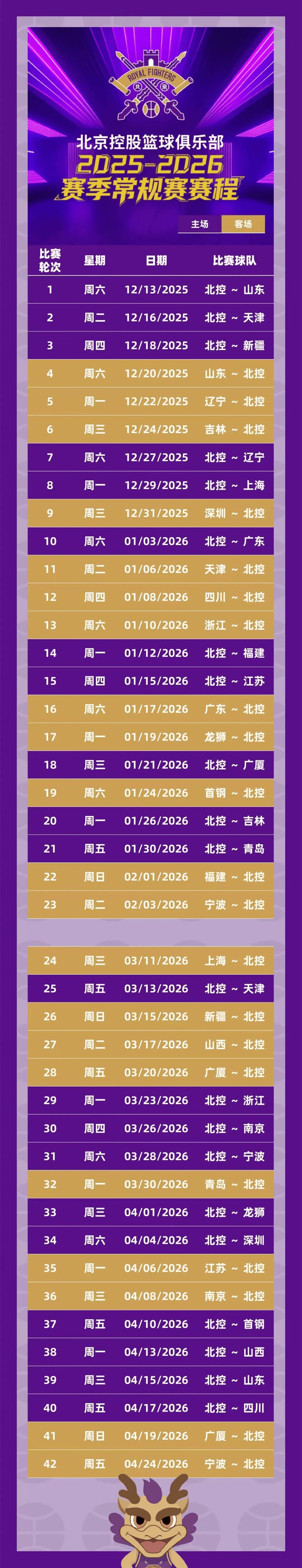 新赛季常规赛将于2025年12月12日开赛,至4月24日完成最后一轮的比拼。北控男篮的首场比赛将会在12月13日于奥体中心体育馆进行,对手是上赛季季后赛首轮对手--山东男篮,而最后一轮球队则会南下浙江迎来宁波男篮的挑战!”