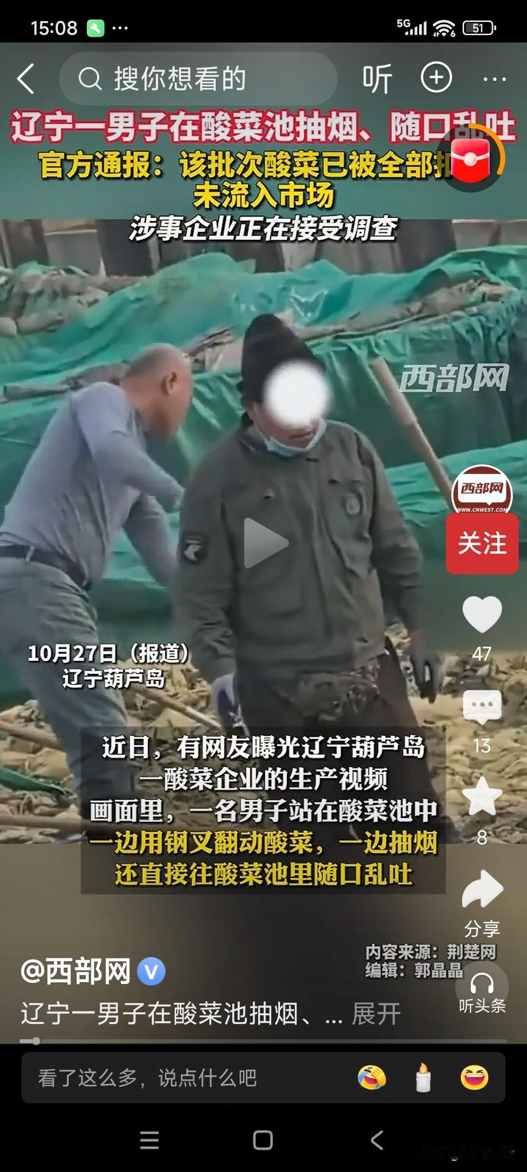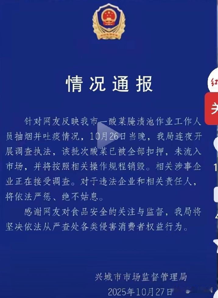 葫芦岛酸菜,吐痰抽烟后续,兴城市连夜执法,此批次酸菜全部扣,销毁,该员工和企业将严惩! 看这员工抽烟,弹烟灰,吐痰的动作,很自然,没有刻意避人,估计以前上班也没少干吧? 这次幸运被人看到,拍下,以前的呢? 这批次被扣了,谁能保证上一批次,没有问题? 相信看到的都很恶心, 估计老坛酸菜没人敢吃了, 不知道,来一桶老坛酸菜面,销量会不会受影响? 真是一颗老鼠屎坏一锅汤! 现在不仅是个人的问题, 显然企业也有责任,如果有严格的卫生管理标准,我相信他也不敢这么做吧? 食品卫生,重中之重, 只有严格厂规,才是规范生产的,也能保证合格的产品!