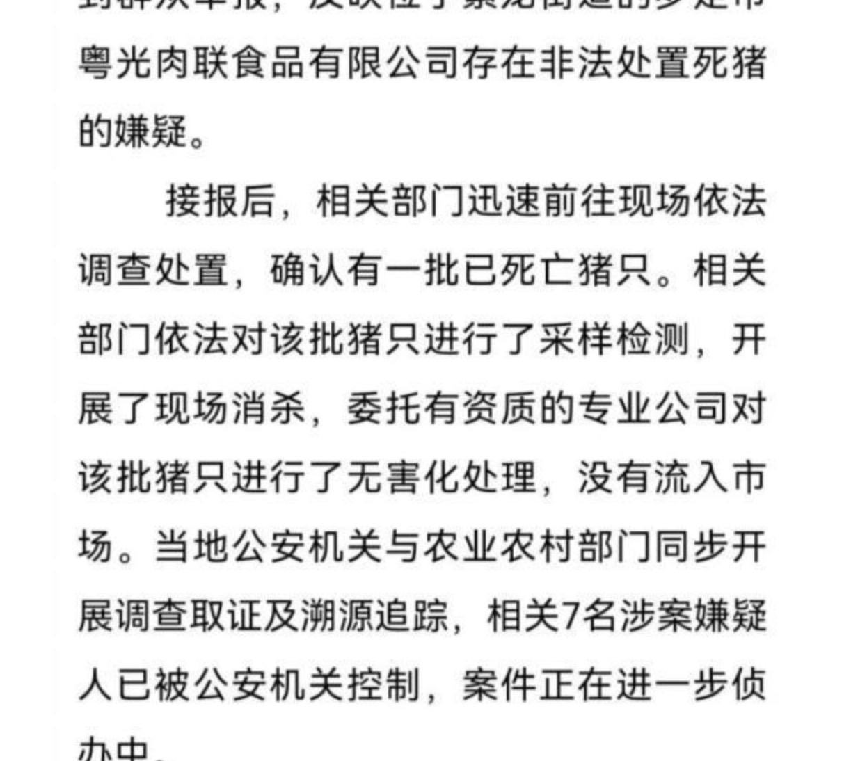 看完这起事件真的是让人脊背发凉啊! 在广东一肉联公司门口堆满了大量的死猪,而且是那种明目张胆毫无遮挡的那种,随后当地有关部门迅速的介入,在对这批死猪进行了无公害处理后,立即对现场进行了消杀处理,并且现在已经有7名人员被控制,而案件还在进一步的调查中。这起事件不能随着这批死猪,被无公害的处理,以及相关人员被控制,就这样的结束了,而应该继续调查下去。重点在于三个方向 第一,这批死猪到底是从哪来的?又是不是非正常的死亡?身上有没有携带有病菌?第二,肉联厂门口堆放这么多的死猪,到底又是为了什么?是不是想要把这些死猪给二次利用?第三,在这起事件被曝光之前,这家肉联厂有没有明着暗着做类似的行为,并且有死猪被他们加工过,已经流入到市场,到了百姓的餐桌上? 这些问题不应该只是成为问题,而应该是一一查明,给大众一个交代。与此同时,我们也要反思一下,为何“老痰酸菜”事件,死猪肉等食品安全事件屡禁不止?其实类似事件则是暴露出了两个关键的问题,一个就是在监督的环节存在漏洞的,类似事件的曝出往往都是正义的网友给曝出,而本该起到监督作用的有关部门,却总是后知后觉,有大众来监督是好事,但是凡事不能单靠大众,否则设立监督部门毫无意义。 另外一个就是违法成本的问题,就像是这起事件一样,死猪直接大批量的堆在门口,这是一点都不避讳,他们不可能不知道这是违法的,可明知道违法还这样做?只能说明处罚对他们来说,不过就是挠痒痒而已。食品安全是一个底线问题,是不能触碰的红线,发生类似的事件,我们心痛的同时,更应该查漏补缺,堵上监督的漏洞,增大违法的成本,震慑一下这群黑心的商人。
