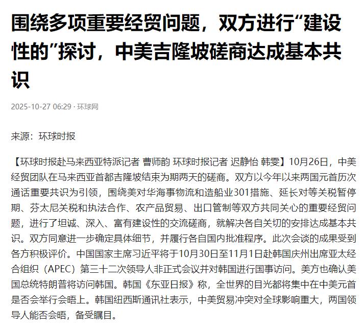 一场在吉隆坡关了门谈了10小时的谈判,结束之后没有联合记者会,没有签字仪式,但懂行的人都在抠字眼——因为双方通报里,各藏了一句“过去几乎不可能出现”的话。 中方通报里说得那叫一个直接:“美方说自己立场的时候挺‘强硬’,我们维护自己利益也很‘坚定’。” 这俩词单听不新鲜,但写进正经的谈判通报里,这么不拐弯抹角的,真少见。以前就算谈得再僵,通报里也常用“聊得坦诚”“有建设性”这类话打圆场,这次直接把“强硬”“坚定”摆出来,意思很明白:两边博弈得厉害,但我们半步都没退。 更让人意外的是美方那边,居然主动说起“平等”“尊重”来了,说愿意用这俩方式解决分歧。要知道这几年,这俩词在美方嘴里跟敏感词似的,轻易不提。以前他们一开口就是“按规则来”“凭实力说话”,潜台词其实是“听我们的规矩”“跟着强者走”。 就像10月初,美方还放风说11月要给中国商品加100%的关税,财长贝森特说话都带着一股子火药劲儿,这才没几天,说话的调子就变了。 这两句反常的话,可不是随便说说的,背后10个钟头里,两边掰扯的全是难啃的硬茬,互相加的关税要不要延期、出口管制怎么协调,还有农产品贸易、芬太尼合作这些老难题。能把这些卡了好几个月的事儿重新摆上桌聊透,本身就是个信号。而且美方谈完立马松了口,贝森特就说,不打算再加高额关税了,还提到搭了个“能往下推进的架子”,就等两国高层过目。 其实细想也不奇怪,美方这会儿是真没多少硬扛的本钱。国内物价还没稳住,供应链又跟中国绑得死死的,单说大豆这种农产品,离了中国市场不行,更别说稀土这种关键材料,还得靠中国供应。以前总想着靠施压要好处,现在发现拿“实力压人”那套不好使了,才肯把“平等”“尊重”捡起来说。 不过中方也没跟着往高了喊,通报里就说“初步谈拢了点”,还强调“得走内部审批流程”,不夸大、不冒进。这种稳劲儿正好对应了那句“维护利益很坚定”,该争的一分不让,谈成的部分踏实推进,不搞那些虚头巴脑的面子事儿。 虽说没搞签字仪式、没发联合声明,但从通报里抠出来的这两句话,早就把事儿说明白了:美方没完全松口,但态度确实松了点;中方没妥协,立场反倒更清楚了。这哪儿是简单改了说话的调子啊,分明是两边在重新找怎么相处的分寸。 接下来就看内部审批能不能顺顺利利的,毕竟真正的成果,从来不是写在通报里的漂亮话,而是能落到实处的约定。