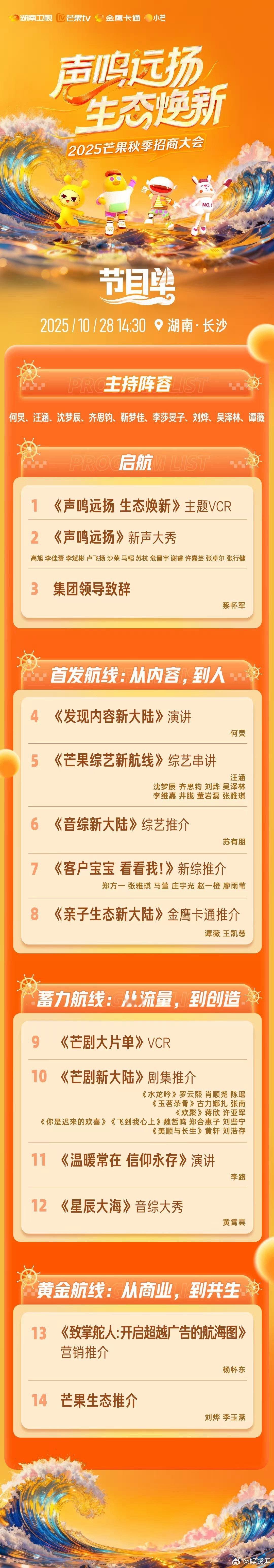 芒果秋季招商大会节目单 光是听《歌手2025》“全球音乐世界杯”的设定就燃起来了!4K超高清直播+陈楚生加盟,耳朵先预定年度盛宴。