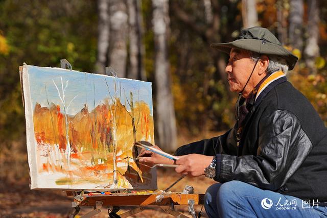 10月26日,一名长者在吉林长春南湖公园白桦林中创作油画。人民网记者李洋摄