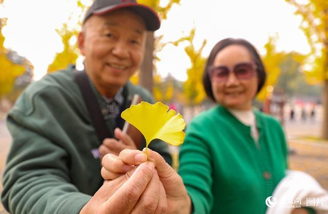 10月24日,山西省太原市晋祠博物馆秋意浓郁,一对老年夫妇手持银杏叶向记者的镜头展示深秋之色。人民网记者王帆摄