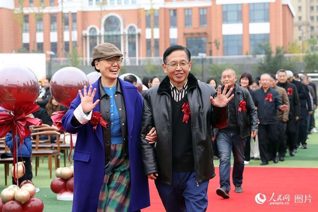 10月26日上午,山东省济南市高新区金谷小学操场上,99对金婚老人在学生志愿者的引导与祝福下,携手踏上红毯,重温数十年前的美好瞬间。人民网记者刘祺摄