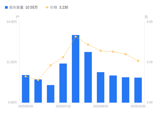 日期A股户数(户)流通A股户均持股数(股)户均持股市值(万元)2025-09-3010254420441.416.322025-09-1910570019831.076.662025-09-1010680019626.826.692025-08-2910890019248.346.602025-08-0812140017202.636.112025-07-3113190015833.205.872025-07-1811420018287.216.032025-07-1010090020697.716.502025-06-3010437820008.045.702025-05-3010710019620.655.73