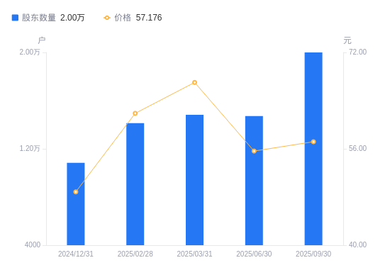 日期A股户数(户)流通A股户均持股数(股)户均持股市值(万元)2025-09-301999413034.0674.522025-06-301472017704.0198.482025-03-311482617577.44117.812025-02-281413118441.94114.142024-12-311084224036.44117.422024-09-301014825680.2495.452024-06-301120823251.5273.332024-03-31973426772.45105.002024-02-29929228045.96111.952023-12-31903628840.53134.19