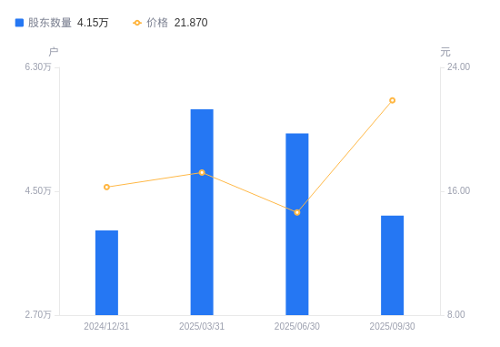 日期A股户数(户)流通A股户均持股数(股)户均持股市值(万元)2025-09-304146553079.52116.082025-06-305341141120.2560.162025-03-315692738579.2366.392024-12-313931055725.1790.662024-09-303902356680.5089.222024-06-304077454225.5785.782024-03-313683260010.7480.052023-12-313643460657.4088.622023-09-303922355624.6678.382023-06-304372749887.6772.14