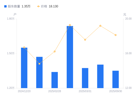 日期A股户数(户)流通A股户均持股数(股)户均持股市值(万元)2025-09-30135065050.099.162025-06-30140344823.219.262025-03-31137364927.858.672025-03-10173783894.897.512025-02-28133935053.798.202024-12-31147074602.266.822024-12-20155044366.627.292024-09-30154784373.956.892024-06-30152934426.866.612024-06-20152414441.976.61