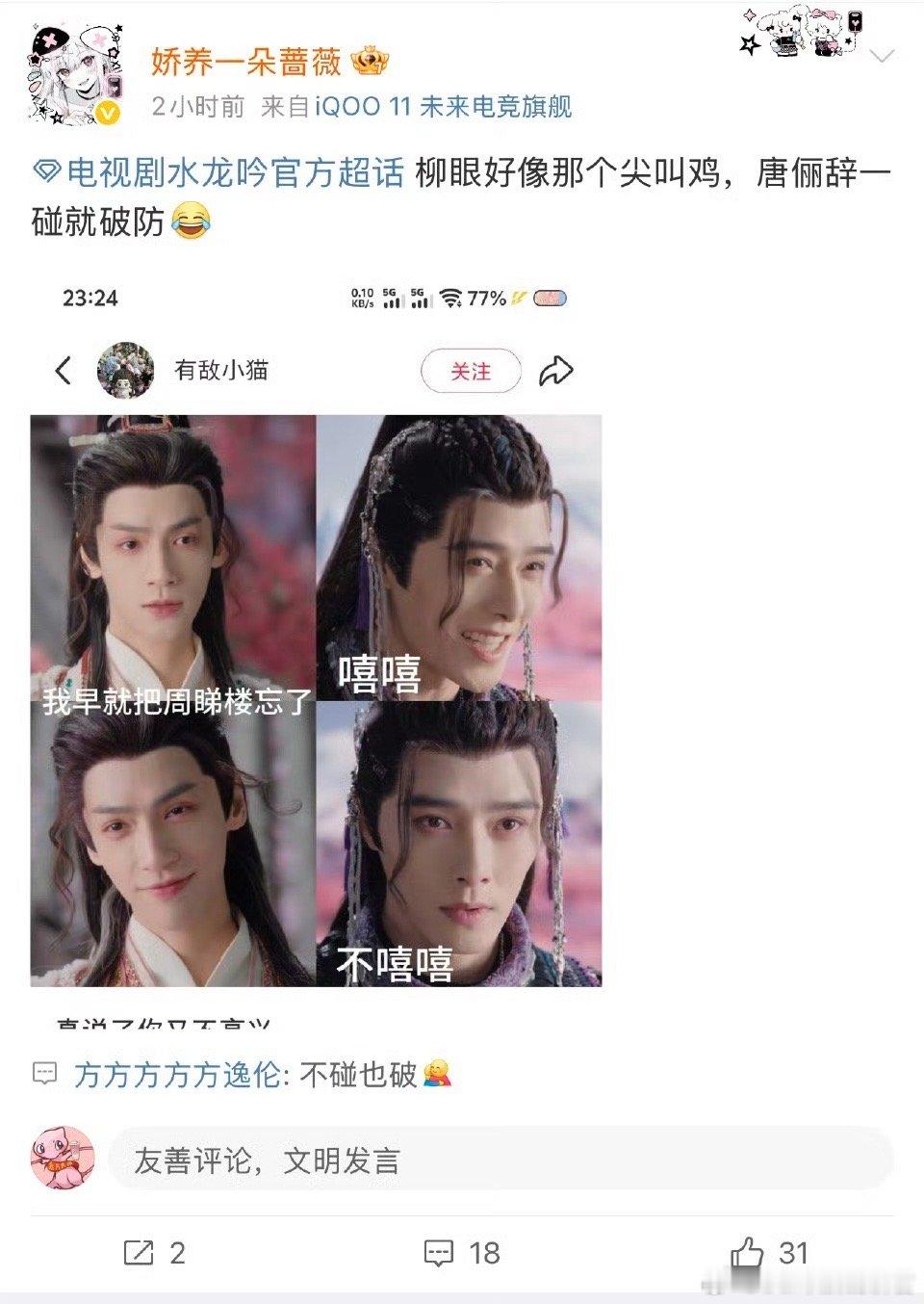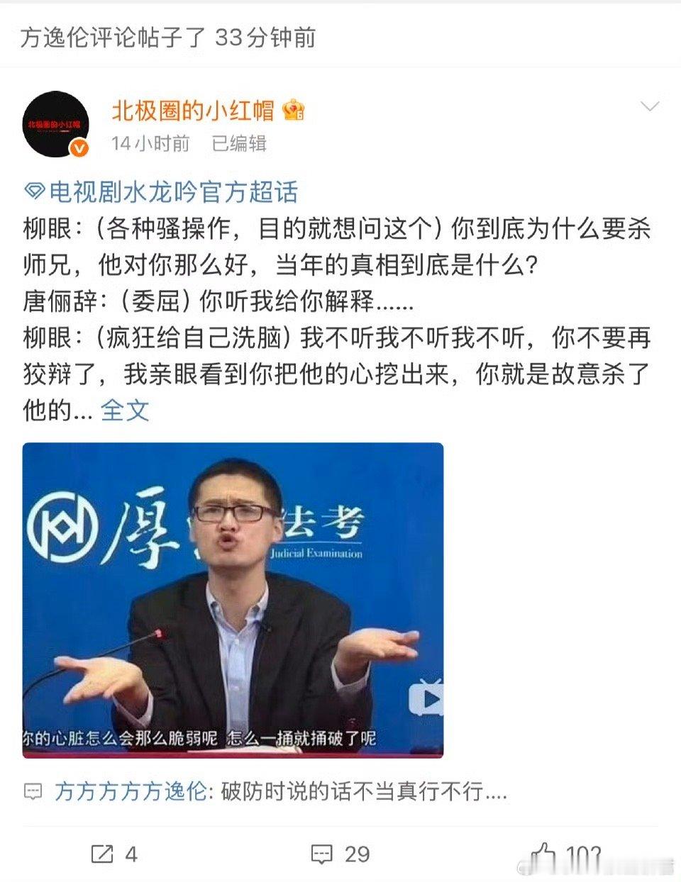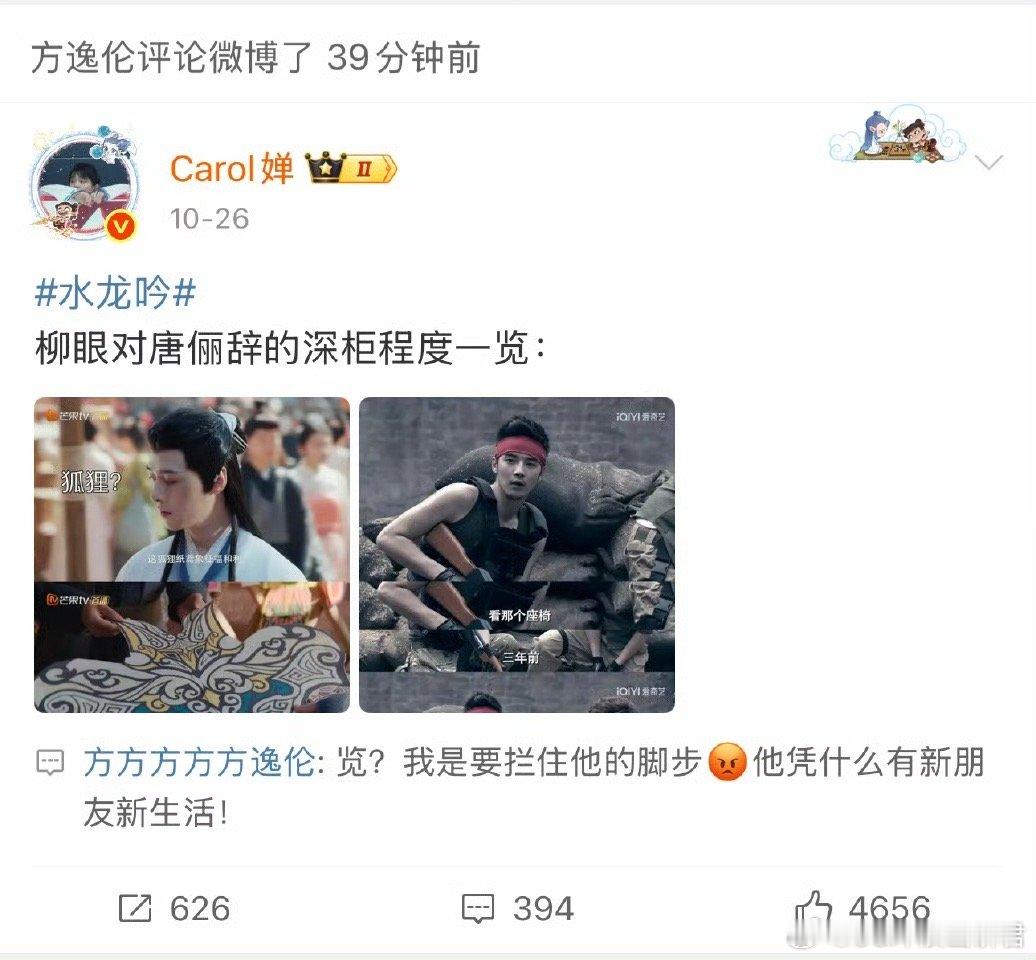 方逸伦大闹水龙吟剧超 方逸伦一个人扛起整部剧的宣发KPI!柳眼在超话里上蹿下跳,标记唐俪辞比狗仔还勤快。剧粉:我们超话是成了反派的后花园吗?