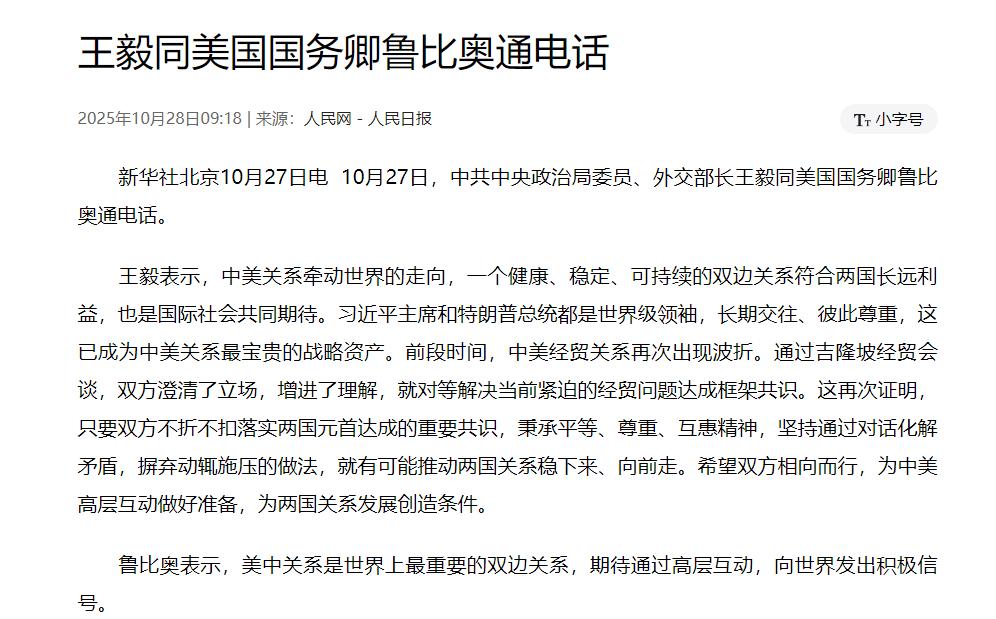 新华社北京10月27日电,中共中央政治局委员、外交部长王毅同美国国务卿鲁比奥通电话。王毅表示,前段时间,中美经贸关系再次出现波折。通过吉隆坡经贸会谈,双方澄清了立场,增进了理解,就对等解决当前紧迫的经贸问题达成框架共识。鲁比奥表示,美中关系是世界上最重要的双边关系,期待通过高层互动,向世界发出积极信号。 半个多月前,中美经贸还僵得厉害,美方都放话要加100%的关税了,现在居然能坐下来谈出个框架共识,这变化快得让人都忍不住说句“不容易”。 从9月份开始,美方就没闲着,一会儿把中国企业列进限制名单,一会儿又搞新规则扩大限制范围,把经贸这摊事儿搅得乱七八糟。到10月初更热闹,中方刚出台稀土出口的管制措施,美方就放话11月要加税,还威胁不让咱们买关键软件,把全球金融市场都搞得慌慌张张的,结果没两天特朗普又突然说“都会好起来的”,这变来变去的操作也是没谁了。 明眼人都能看出来,美方这是一边想靠施压捞好处,一边又怕真闹起来自己扛不住,毕竟加税的钱,最后还是美国企业和老百姓买单。 好在这两天吉隆坡的会谈没白开。别觉得“框架共识”听起来虚,这里面涵盖的事儿可不少,从关税暂停的时间延长,到芬太尼的关税问题和禁毒合作,再到船舶收费、出口限制这些难搞的事儿,双方都摆到台面上谈了。 中方商务部的李成钢都说了,美方谈的时候态度挺硬,但中方护自己的利益也不含糊,整整一天多的紧张讨论才拿出方案,能达成初步共识已经很不容易了。更关键的是,美方这次明确说“不考虑加100%关税了”,这态度比光说漂亮话实在多了。 不过话说回来,这离真解决问题还差得远。就像专家说的,中美经贸里那些根子上的矛盾,不是一次会谈就能抹平的,尤其是半导体、人工智能这些领域的竞争,短时间内肯定还会有。而且现在只是个框架,接下来还得走双方国内的审批流程,细节上稍微不注意就可能卡住。毕竟之前也不是没出现过谈好的事儿又变卦的情况,美方这说变就变的毛病,确实让人没法完全放心。 但不管怎么说,这次能达成共识还是个好信号。王毅外长说得挺实在,关键是要落实两国元首的共识,别动不动就施压,好好对话才管用。鲁比奥也承认中美关系是世界上最重要的双边关系,还盼着高层多互动,给世界传点好消息,这说明双方都清楚,真闹僵了对谁都没好处。 说到底,中美经贸这事儿就像掰手腕,谁也没法彻底压垮对方,反而越较劲越累。这次吉隆坡会谈证明了,只要坐下来平等谈,总能找到双方都能接受的办法。接下来就看双方能不能稳住,别再搞出些出尔反尔的事儿,把框架里的内容一步步落到实处。毕竟对两国老百姓来说,少点摩擦、多点合作,才是真的实惠。