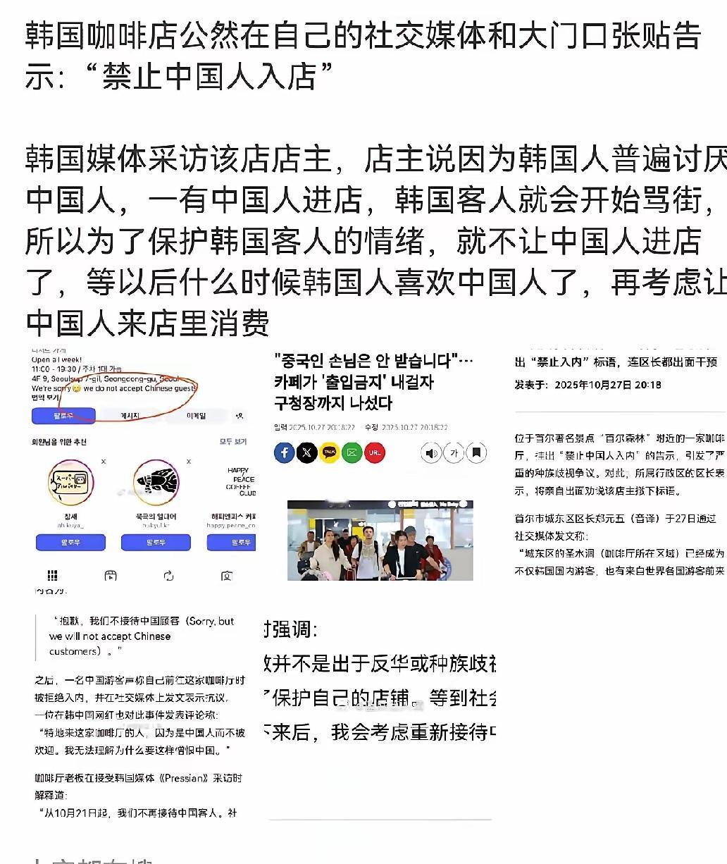 韩国这波操作真是又当又立到极致!一边急着对中国团队游客免签抢红利,一边却有网红咖啡店公然贴出“禁止中国人入内”,老板还嘴硬“这就是我”,简直把歧视写在了脸上。 要知道这家店当初能火,全靠中国博主打卡带流量,现在转头就翻脸,分明是赚够了就卸磨杀驴。韩国旅游业盼着中国游客救市,免税店、酒店忙着搞优惠拉客,结果个别商家却在拖后腿,这种双标嘴脸也太难看了。 所谓“韩国人普遍反感”就是借口,真要是民风如此,怎么还上赶着推免签政策?本质就是既想赚中国人的钱,又不愿拿出基本的尊重。 尊重从来都是相互的,没有哪个游客愿意热脸贴冷屁股,你觉得这种歧视性商家该被抵制吗?