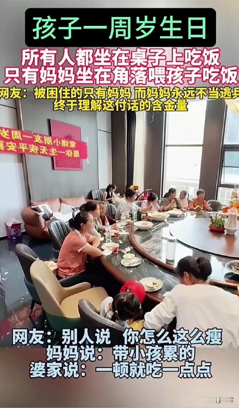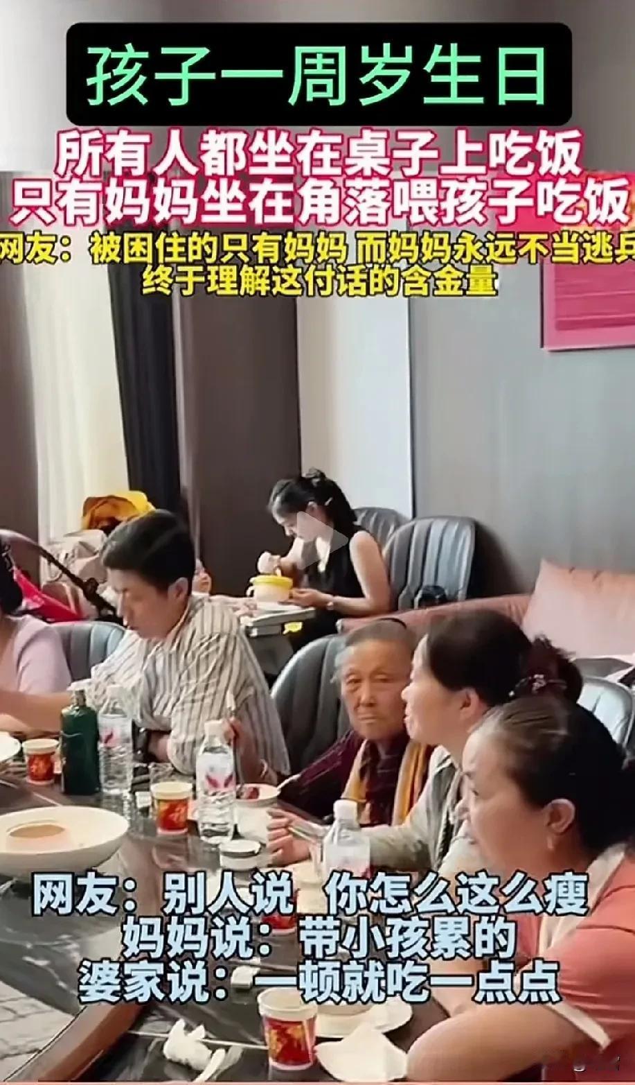 视频上看到这一幕, 被震撼了。 孩子的周岁宴会上, 母亲独自在角落照料孩子, 家人亲戚朋友围坐一桌欢聚, 这一幕在许多家庭中屡见不鲜。 父亲因工作忙碌缺席, 婆婆因身体不适休息, 唯有母亲, 即使生病, 也承担起照顾孩子的重任。 母亲常被视为家庭的“中流砥柱”、孩子的“守护者”, 这种观念在许多家庭被认为理所当然。 这种责任的过度集中让母亲的付出常被忽视, 甚至可能因长期劳累损害健康。 杭州一位母亲的故事令人痛心:她在厨房猝然离世,生前每日奔波于家庭与工作之间,每天只睡两个多小时。 家庭的幸福不应建立在某一个成员的过度付出上。 我们应重新审视母亲的角色, 分担家庭责任, 让每一个成员都能在爱中成长, 也让母亲不再被家庭的重担压垮, 拥有平等与幸福的生活。 母亲的温柔瞬间 母子温情瞬间 图片来源于视频截图,若侵权告知必删