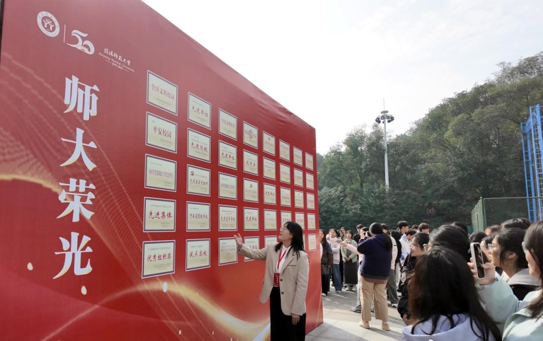 【信阳师范大学建校50周年 】 信师大五秩成就展似时光长廊 一幅幅图片诉说着往昔奋斗故事 教学佳绩与科研突破尽显风华 过往荣光似火点燃万千梦想 感怀过往情长 奋步赴新篇 携梦踏征程再为母校添续荣光