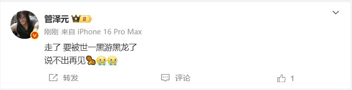 管泽元赛中发文:走了 要被世一黑游黑龙了 说不出再见