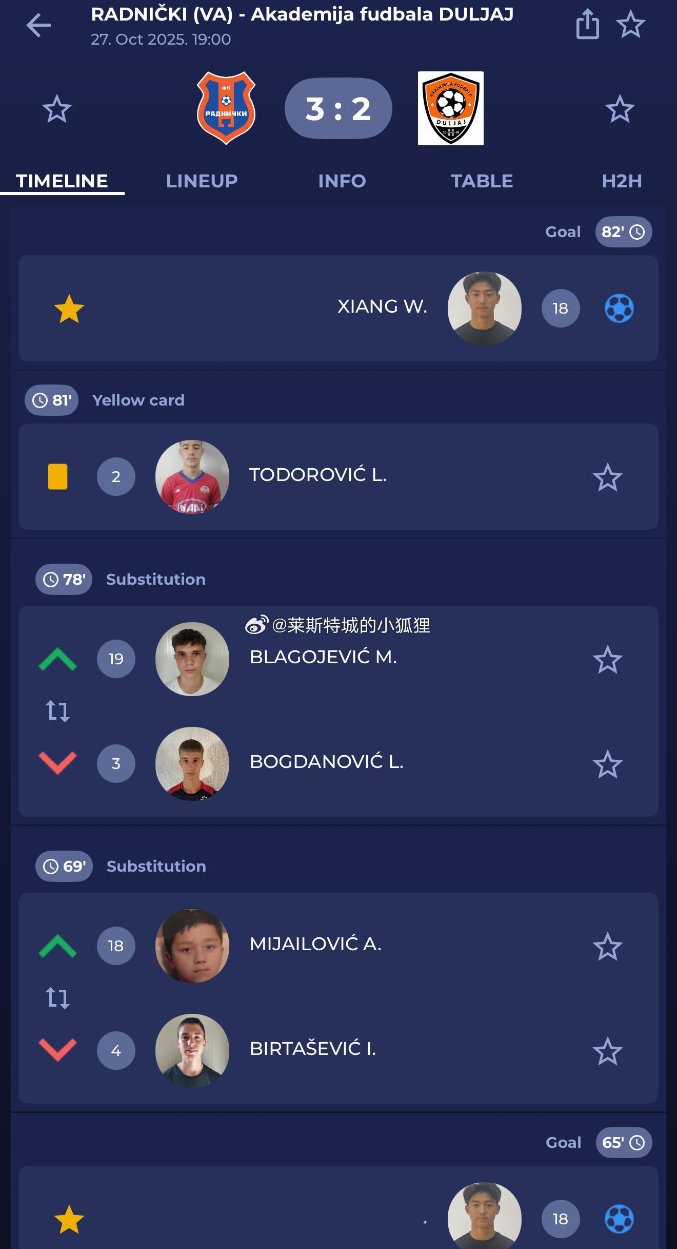 塞尔维亚U19二级 16岁中国球员万项首发出战梅开二度 杜利亚伊足球学院2-3不敌拉德尼基