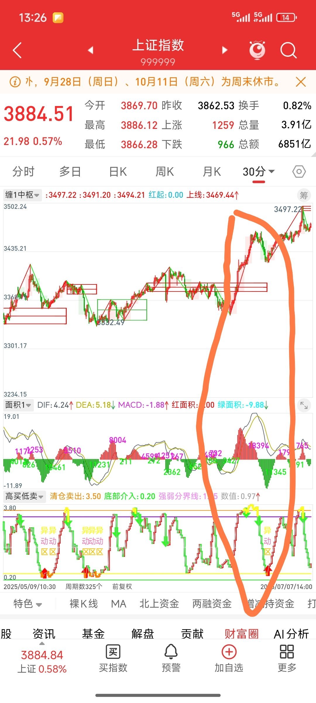 走势上看,这里离4000点也只是临门一脚了。从突破的力度上看,这里量能依然欠缺,所以这里的上涨还是要慎重一点。这里唯一能对比的是7月份的那一次突破。后面我们要观察的就是这笔30分钟级别的回调。A股[超话]