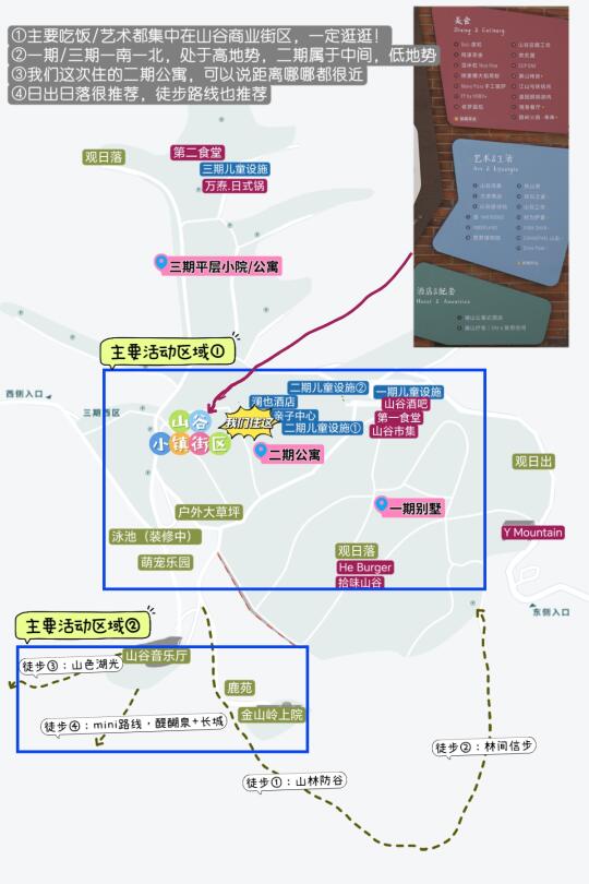 1.一期是别墅loft小院,地势是逐渐升高像梯田一样,中间每一层有楼梯连接,不坐摆渡车步行穿梭也可以,最高点在Ymountain附近,也是②号徒步路线入口,日出观赏地在这。