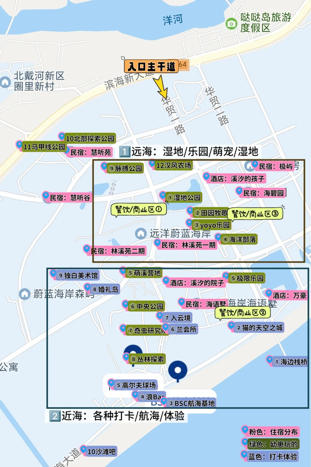 ①中央公园:业主专享,民宿有业主卡可以进去。或者从浪Bar后面也可以进去;丛林探险乐园和海湾寻宝乐园,天空之境、林溪高尔夫、白色教堂…