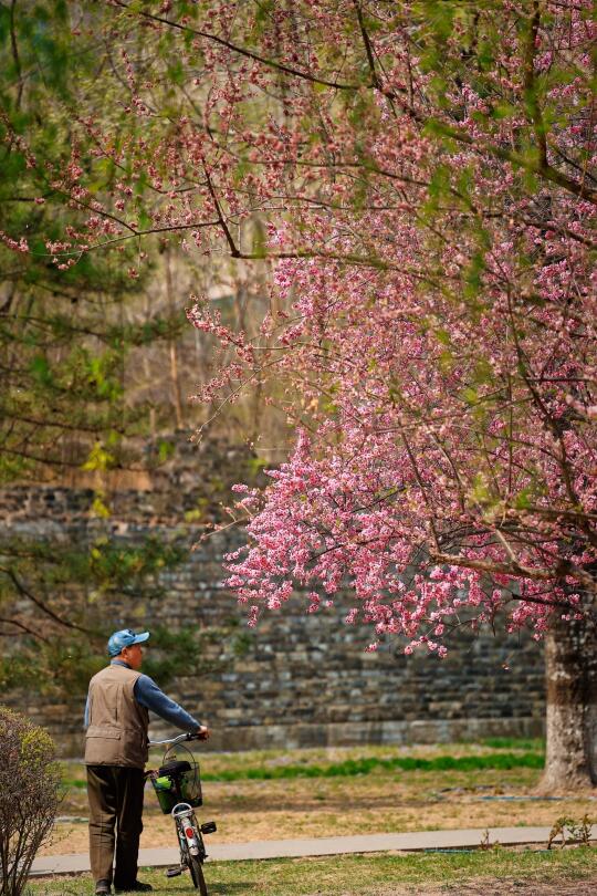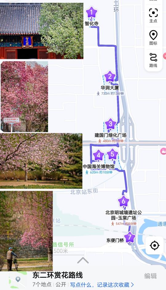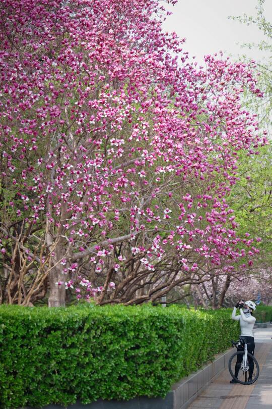 很多人去南侧的遗址公园,但是其实北侧的海棠广场也非常值得逛!人少花艳,最后再去东便门桥上,看看绿皮车和中国尊的同框,也很惬意。