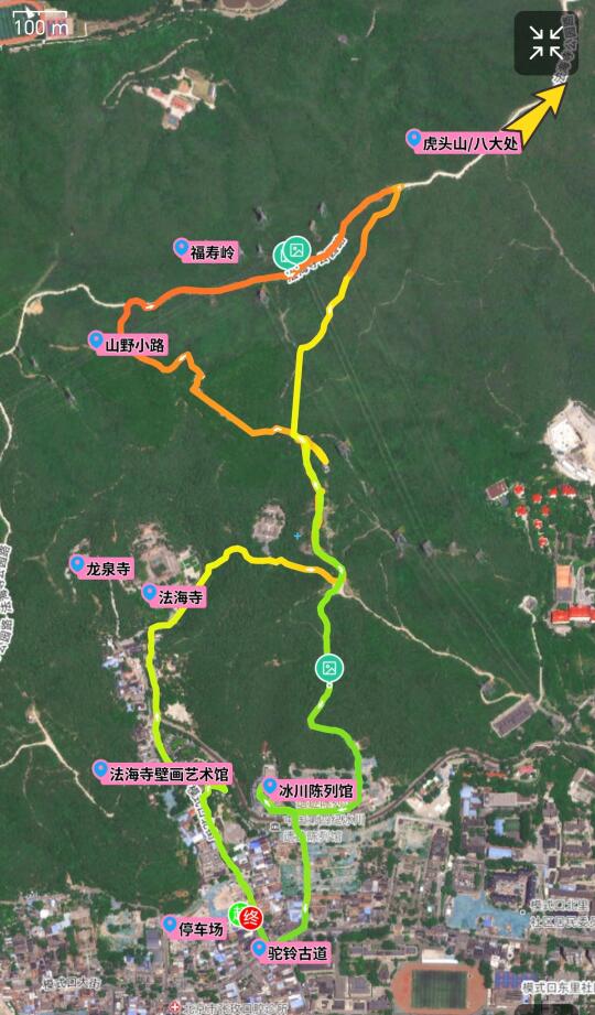 法海寺森林公园[搜索高亮],可导航模式口停车场,4号更近,3号也行,或者法海寺壁画艺术馆停车场.