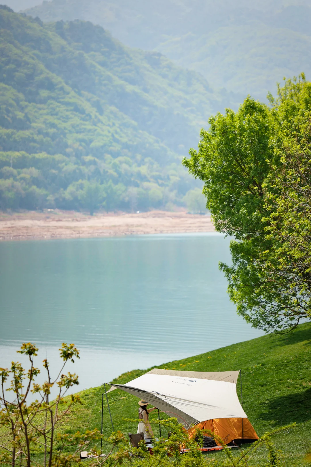 架桌椅,搭天幕,湖边玩
