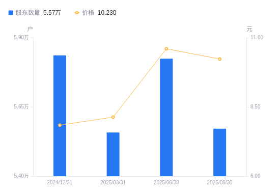 日期A股户数(户)流通A股户均持股数(股)户均持股市值(万元)2025-09-30557129343.059.562025-06-30582438937.049.472025-03-31555749366.257.612024-12-31583628918.826.992024-09-303487714924.4512.612024-06-303792713724.265.812024-03-314910810599.506.252023-12-31580848961.507.752023-09-304347011974.248.292023-06-302772018777.7810.53