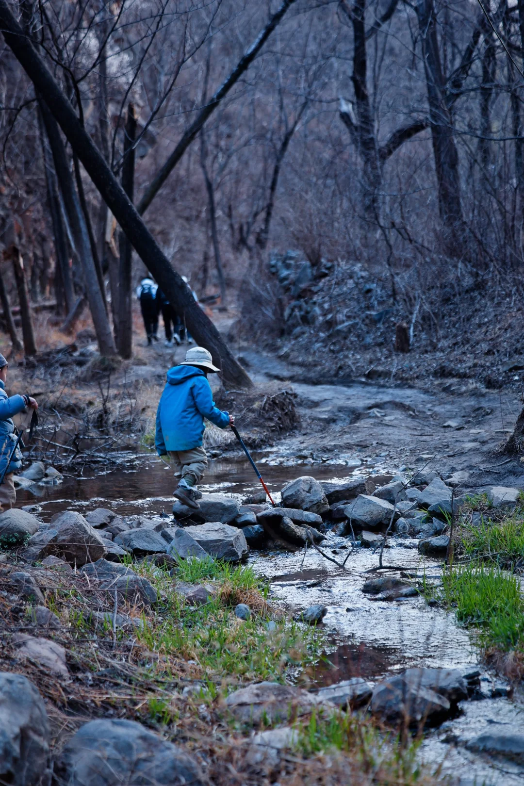 ①再走2-3个烽火台后下山,下山后沿峡谷的路走,小溪水很清澈也很有趣,这一段下山路碎石头略滑。