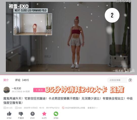 资源在最后一张图(b站) 音乐是韩国男团歌曲 节奏感很强 像蹦迪一样 up主加了动作提示和鼓励的tips 非常有趣 [向右R]时长:35分钟(含3分钟拉伸) [向右R]消耗:240大卡 [向右R]难度:⭐⭐⭐ (每组有10秒组间休息 ) [向右R]推荐:⭐⭐⭐⭐⭐ [向右R] 适合人群:心肺功能还不错//膝盖没有损伤/喜欢蹦跳类动作的宝宝 可以作为入门级的跟练视频(大不了组间休息时间长一点) 温馨提示:非常多蹦跳的动作 所以一定要穿鞋子👟 很喜欢这个跟练视频 消耗非常大也比较容易坚持下来🥰 今日空腹体重:46kg
