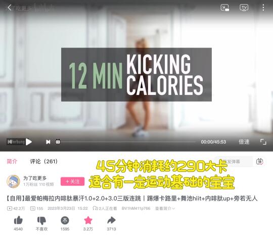 最爱的有氧跟练视频 帕梅拉的四个小片段 可以拉心率 也不会特别累[派对R] 音乐很带感[喝奶茶R] 时长:45分钟 消耗:290大卡 运动强度:⭐⭐⭐⭐ 推荐指数:⭐⭐⭐⭐⭐ 今天空腹体重45.9kg 比前天轻了几两[萌萌哒R] 昨晚吃的椰子鸡 证明了椰子鸡不胖人[吐舌头H] 25年也要努力保持运动状态 一起加油⛽
