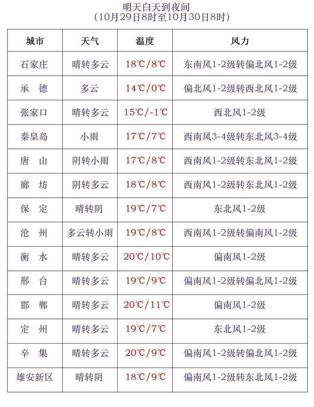 明天夜间到30日,唐山、秦皇岛和保定、廊坊以南地区多云间阴有零星小雨或小雨,其他地区多云。30日早晨,张家口北部、承德最低气温下降3~6℃。