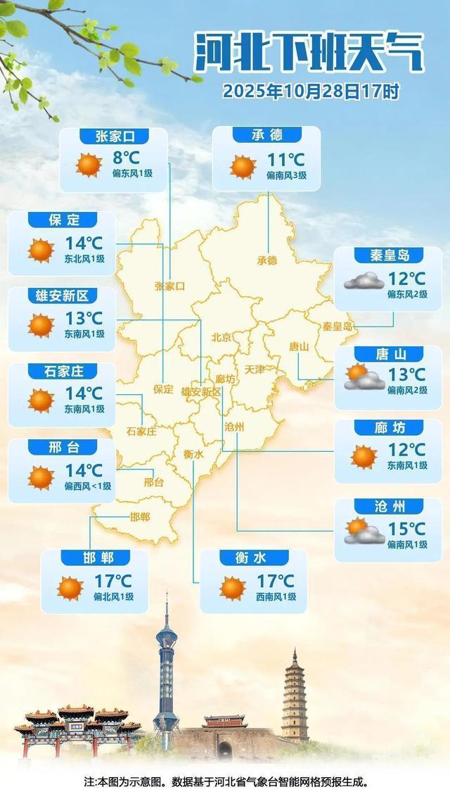 明天白天,张家口北部、承德北部和东部、唐山、秦皇岛多云间阴有零星小雨或小雨,其他地区晴间多云。