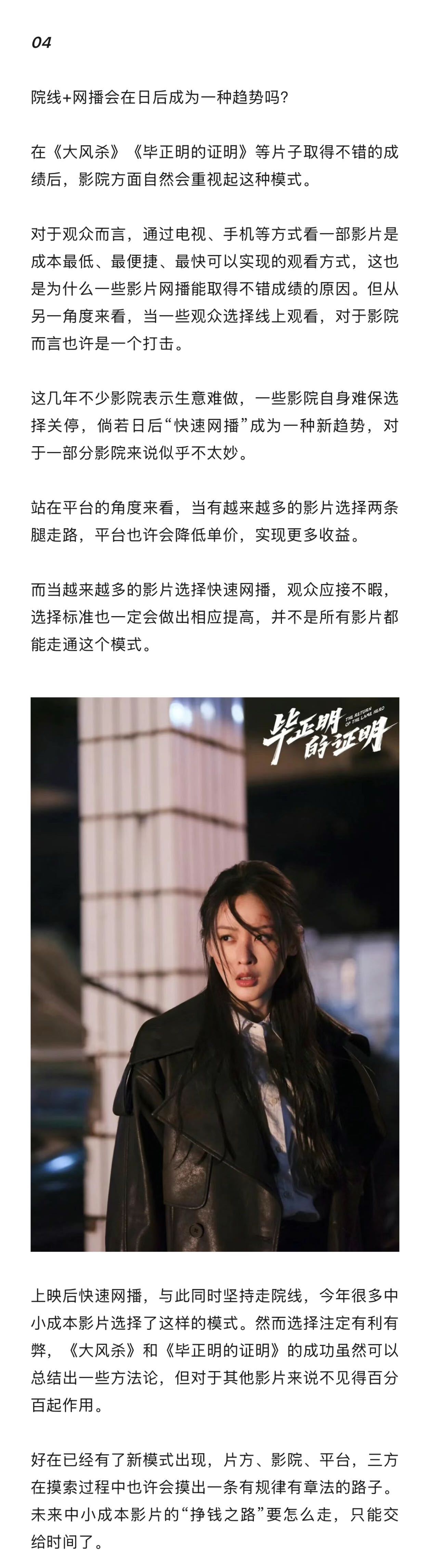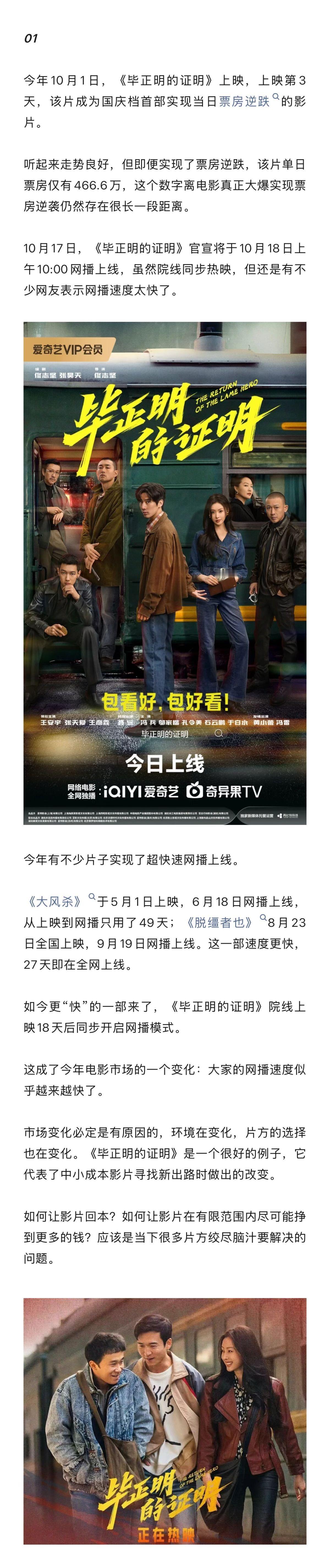 超快网播上线能救中小成本电影吗毕正明的证明 网播分账票房成绩 从国庆档逆跌黑马到网播分账飘红,《毕正明的证明》用“院线+网播”双线走出回本之路,影院经理直言“回本有望”。